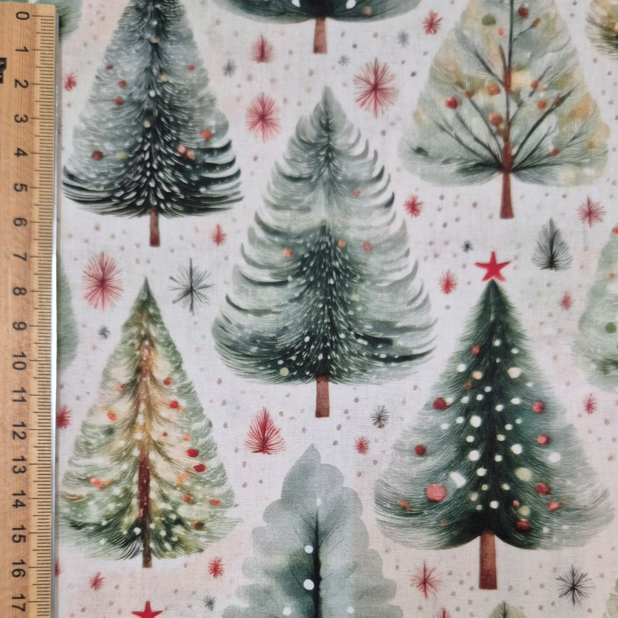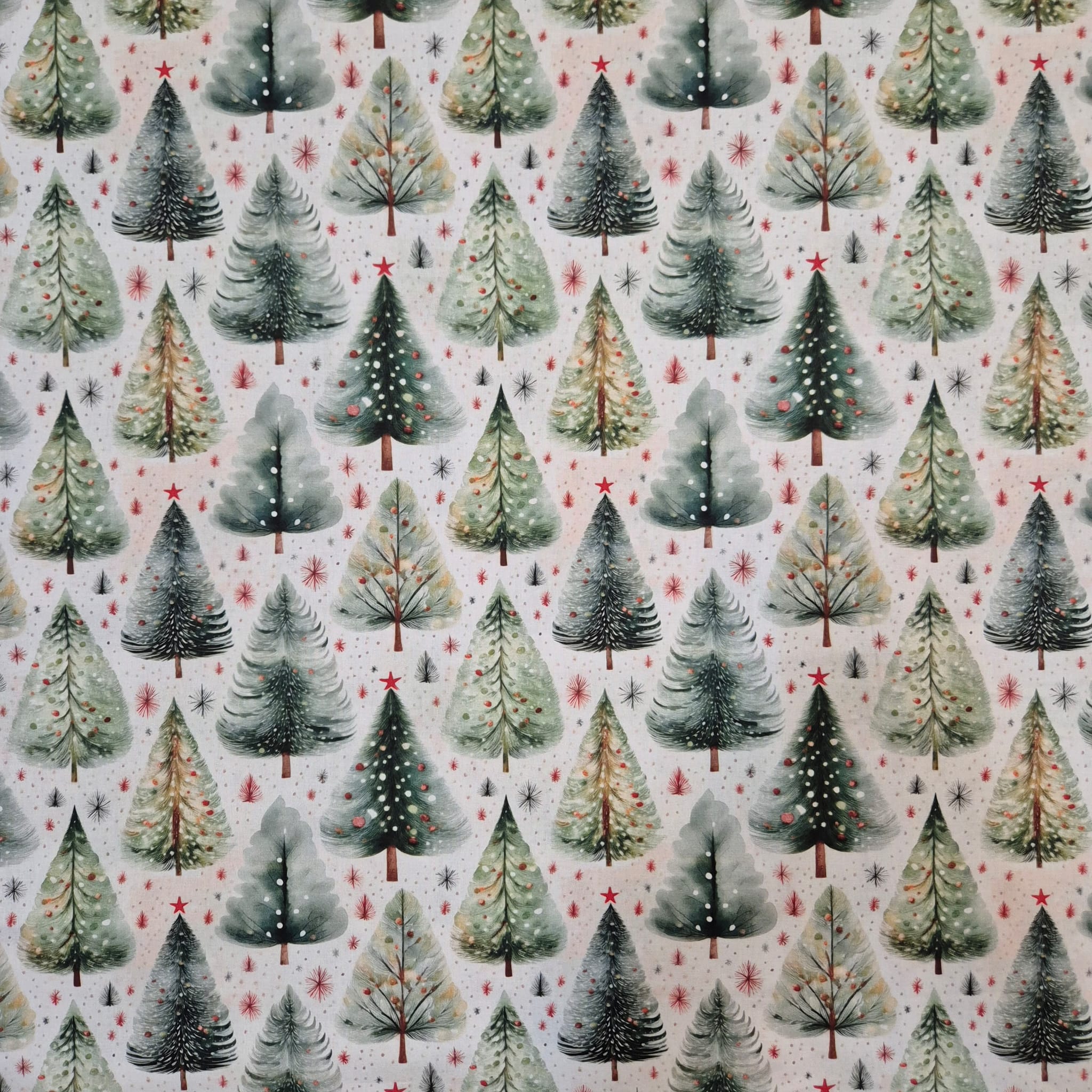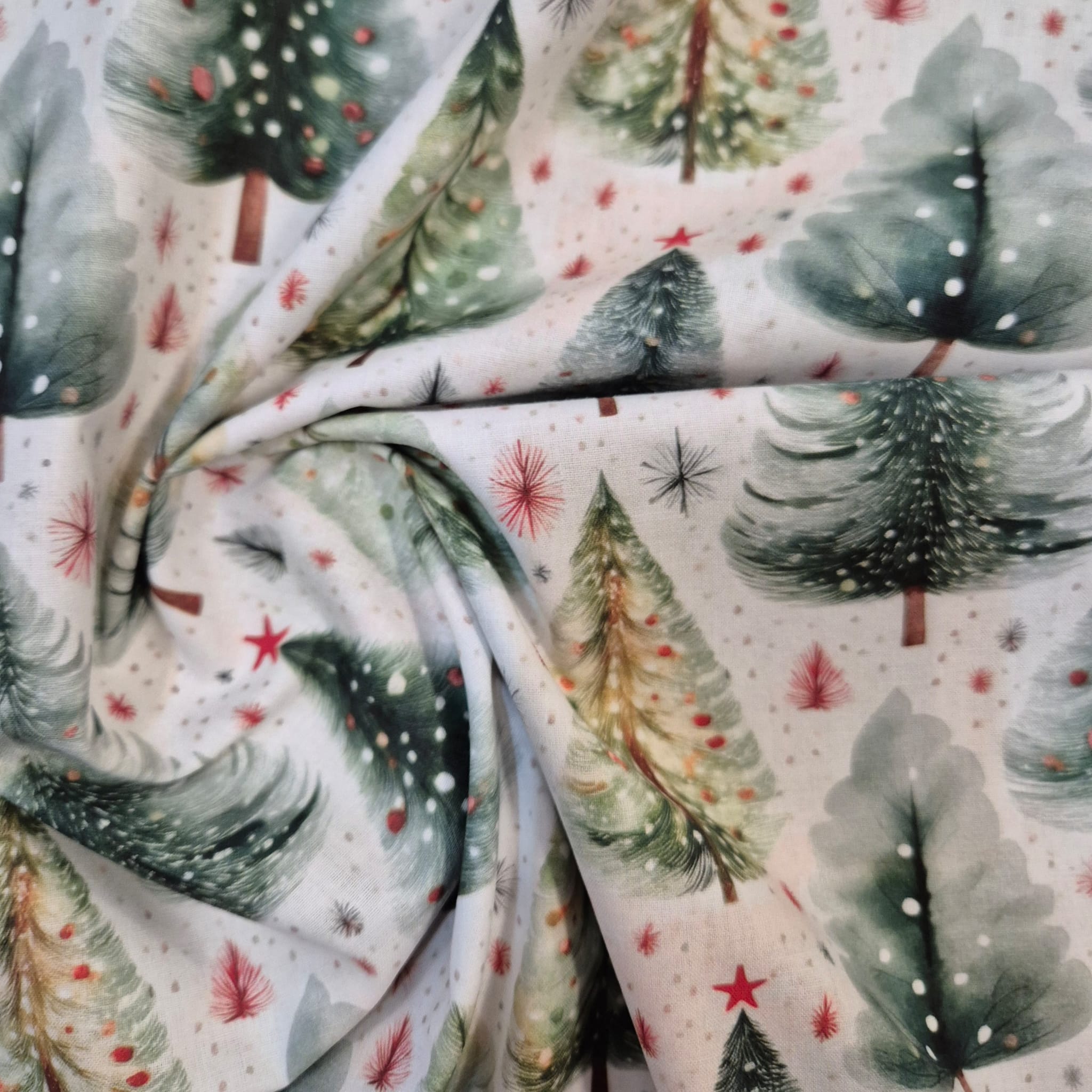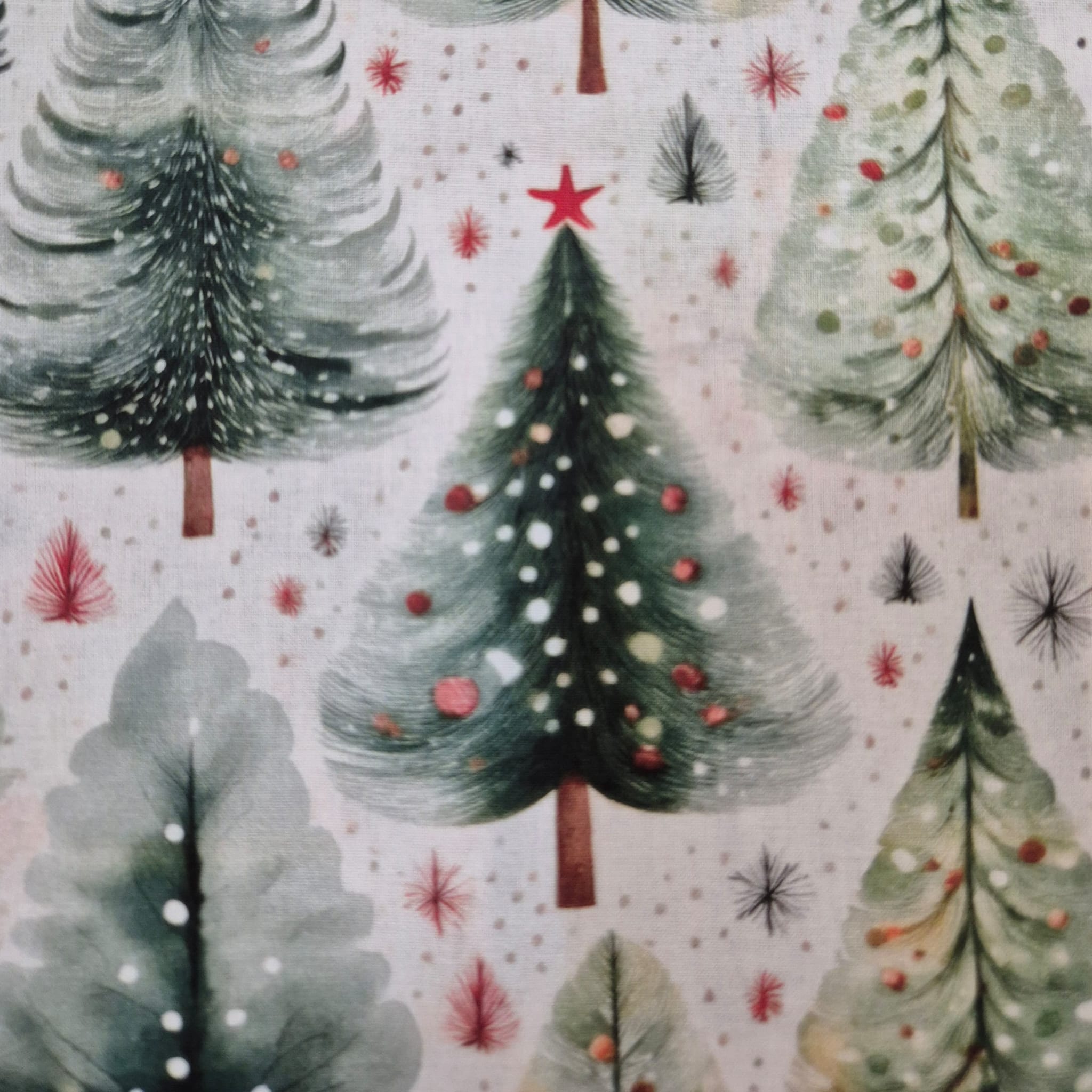 Der Preis bezieht sich auf 1/2 Laufmeter (0,5 m Länge x 1,50 m Breite) Baumwollstoff, einseitig bedruckt mit verschiedenen Tannenbäumen auf schneeweißem Fond. Die Bäume wirken wie mit Aquarellfarben gemalt und dadurch besonders zart und ausdrucksstark.