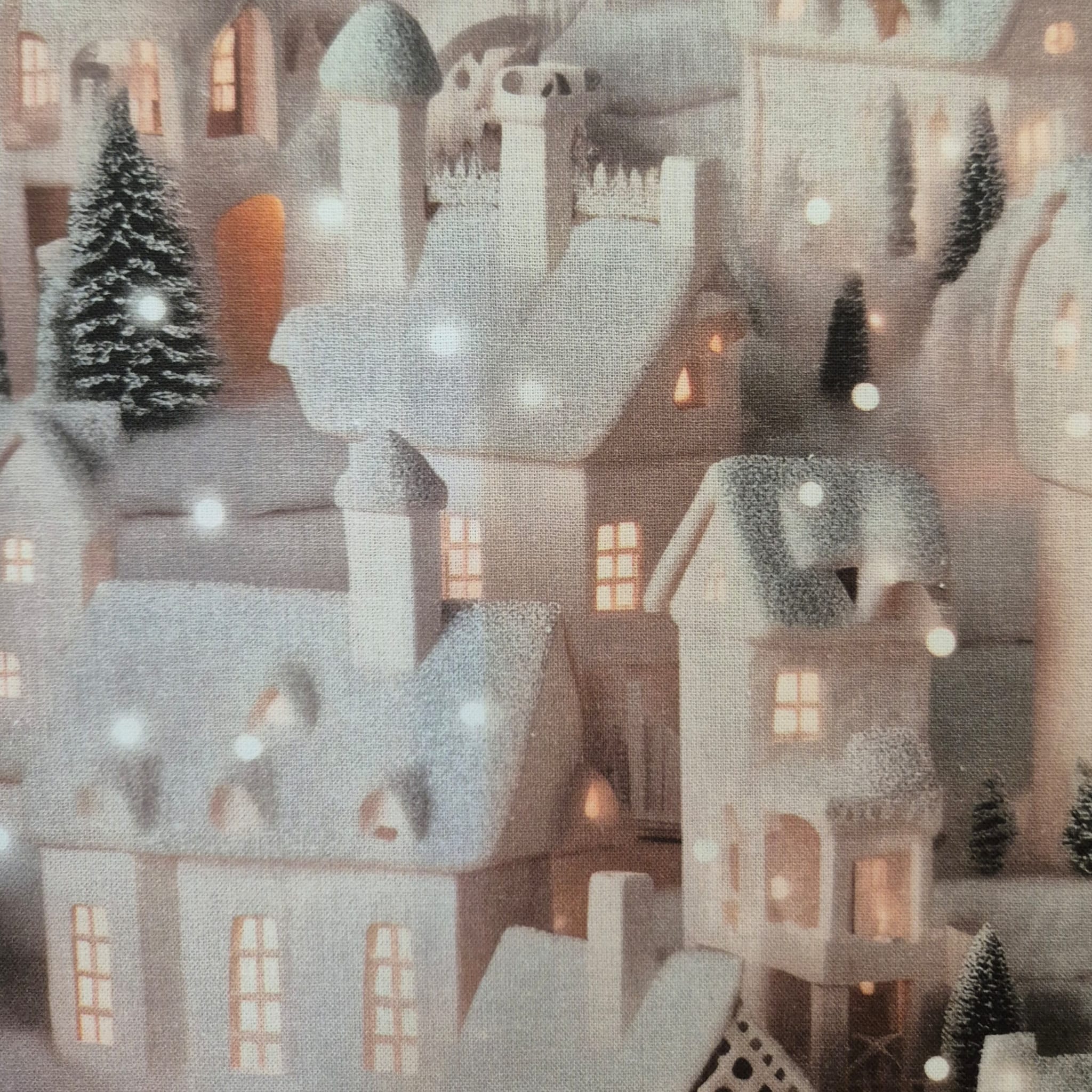 Der Preis bezieht sich auf 1/2 Laufmeter (0,5 m Länge x 1,50 m Breite) Baumwollstoff, einseitig bedruckt mit wie eingeschneit wirkenden, sanft beleuchteten Häusern. Der klare Digitaldruck lässt die Häuschen nahezu dreidimensional wirken und schafft dadurch eine aussergewöhnliche, behagliche Atmosphäre.