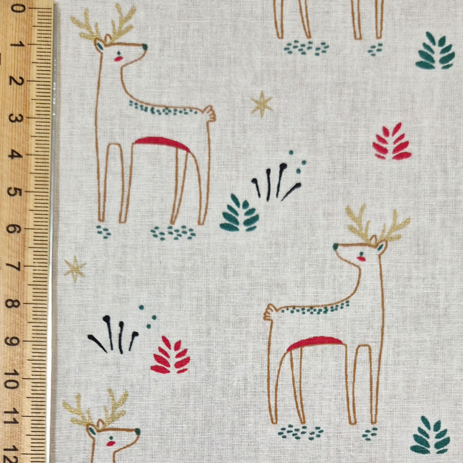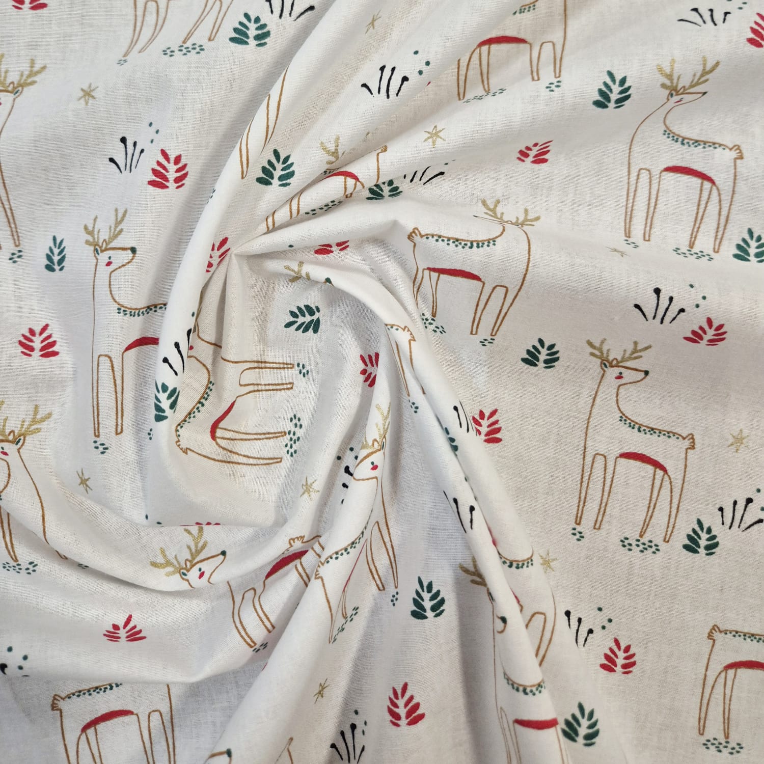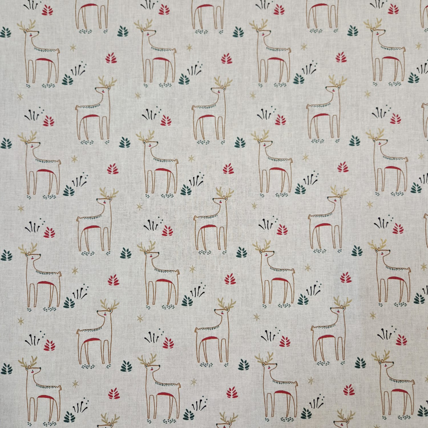 Der Preis bezieht sich auf 1/2 Laufmeter (0,5 m Länge x 1,50 m Breite) Baumwollstoff, einseitig bedruckt mit schlicht gezeichneten Hirschen in den Farben Braun, Rot, Grün und Gold auf weißem Grund. Das einfache aber wunderschöne Dessin bekommt durch die goldenen Geweihe und kleinen Sternchen einen edlen Touch.