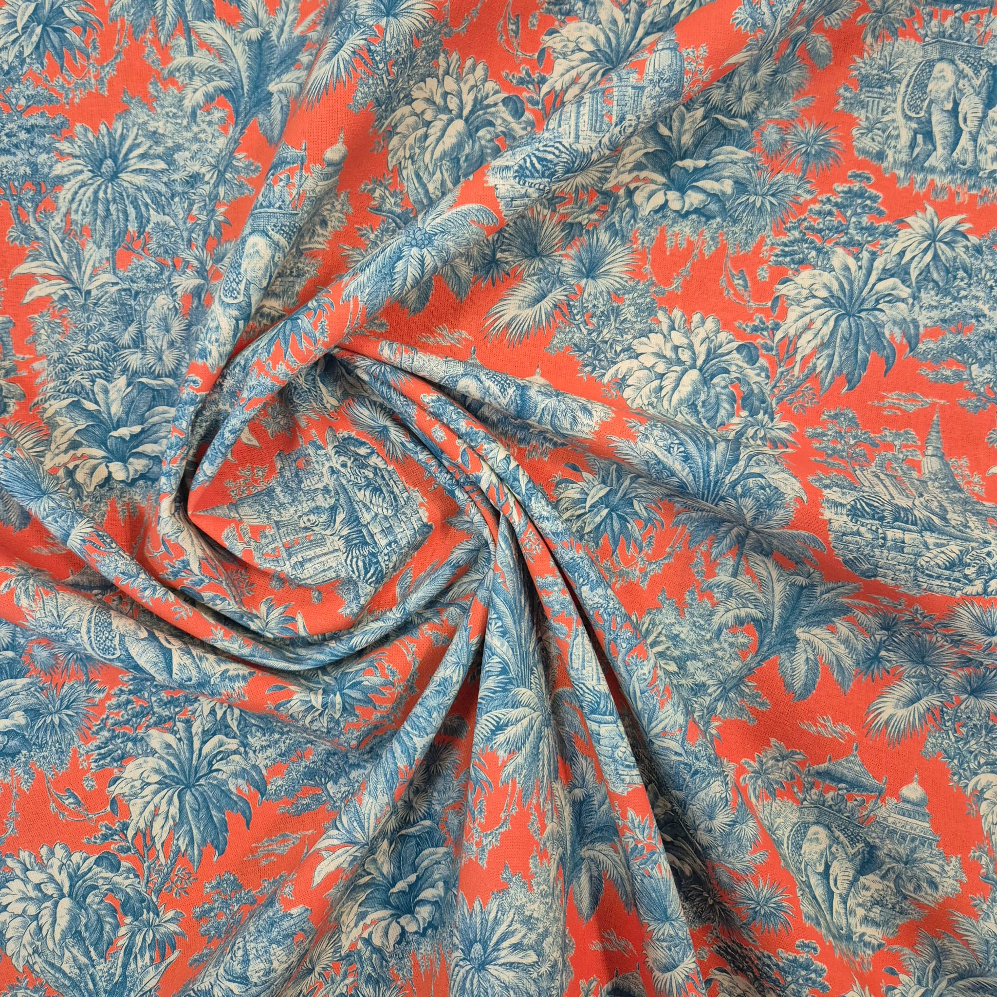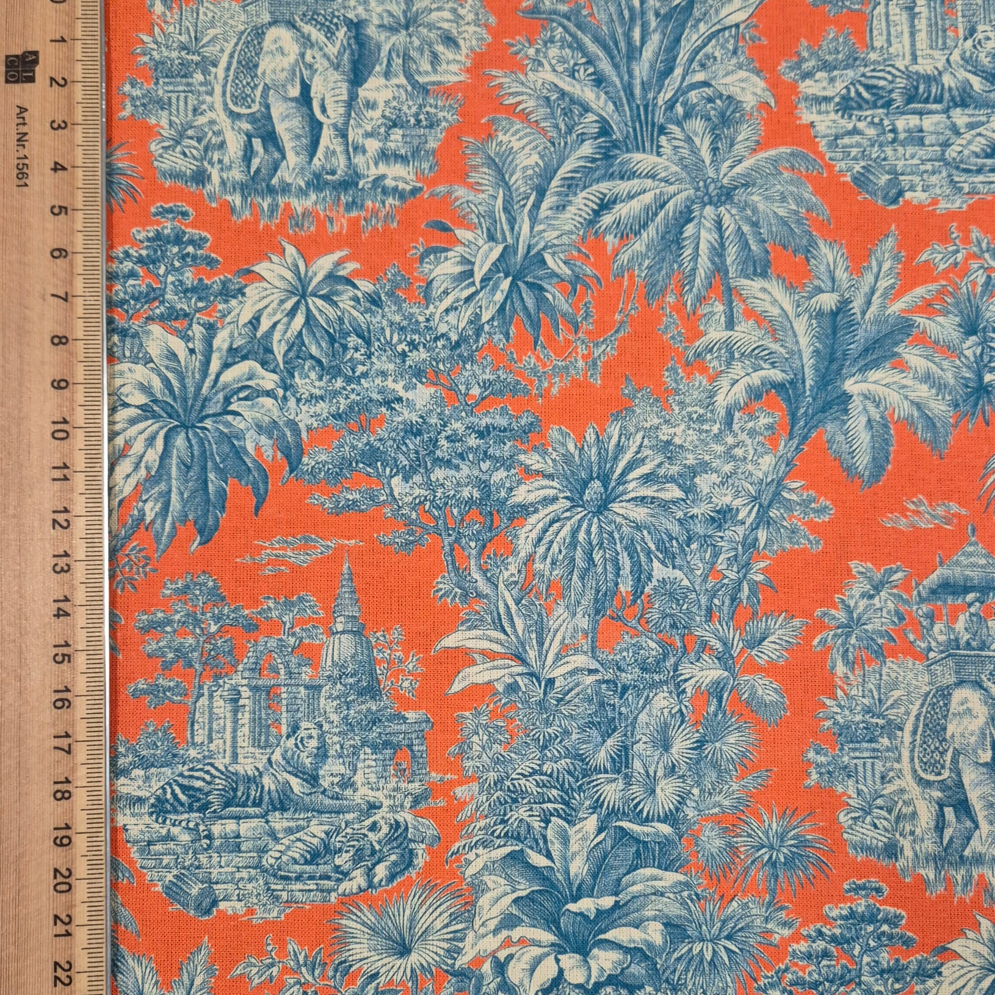 Der Preis gilt je 1/2 Laufmeter (0,5 m Länge x 1,60 m Breite) Baumwollstoff, einseitig bedruckt mit einem exotischen Motiv im Toile de Jouy-Stil. Die mutige und doch stimmige Farbkombi von sattem Orange und edlem Petrolblau gibt dem klassischen Motiv einen völlig neuen, modernen Charakter.
