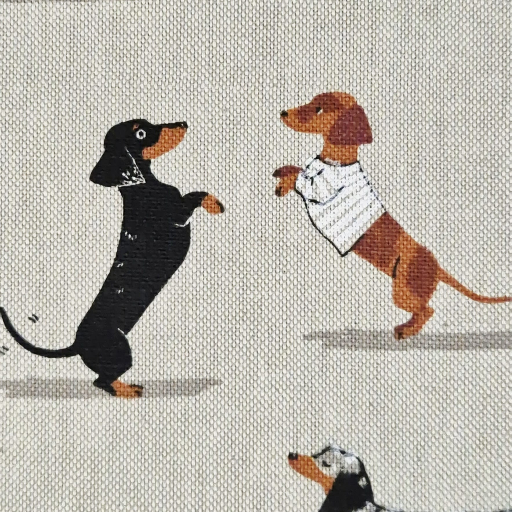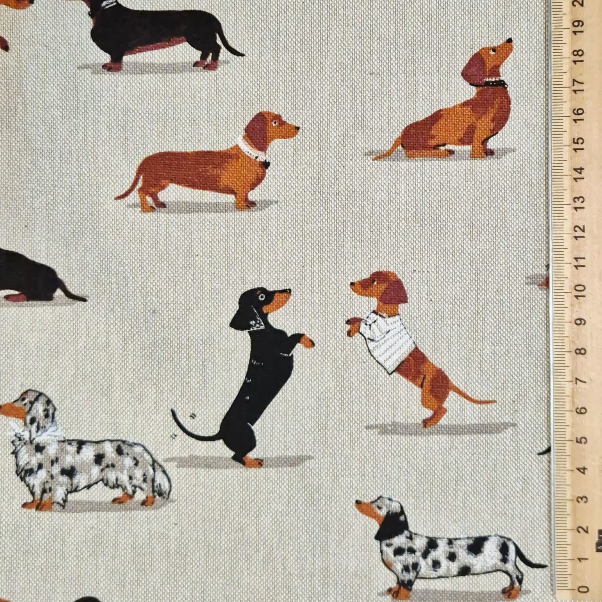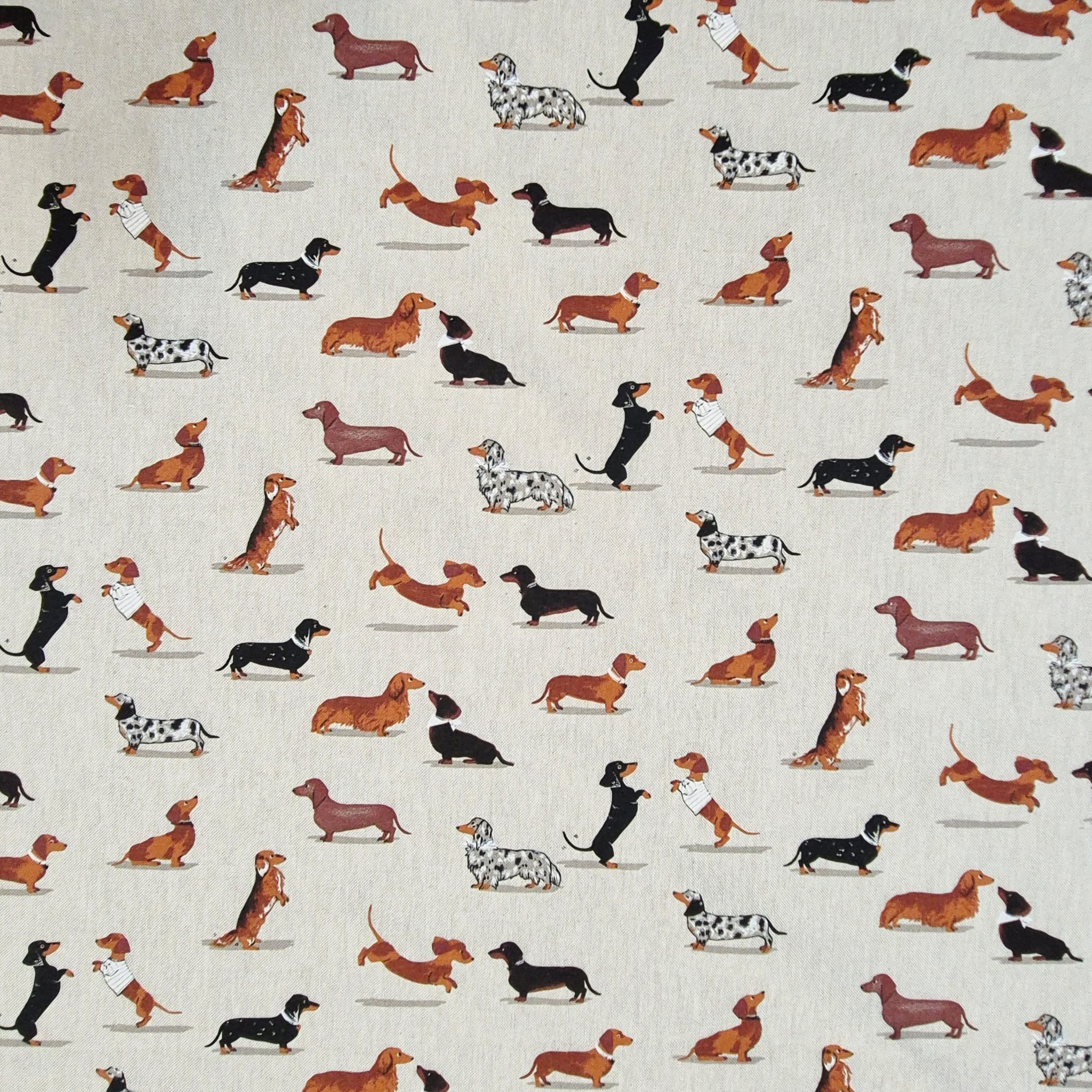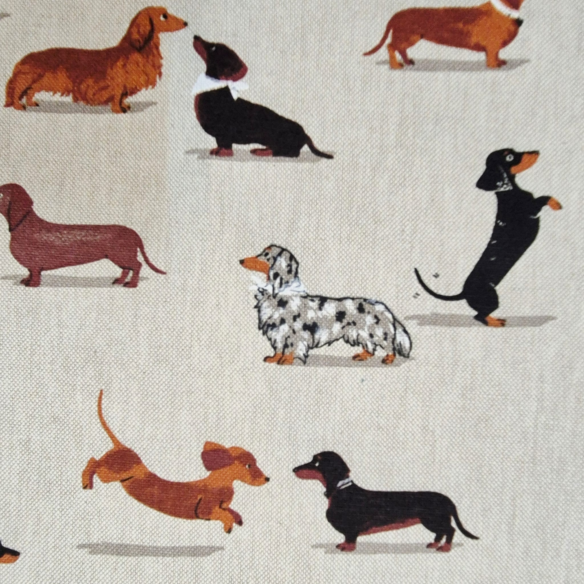 Der Preis gilt je 1/2 Laufmeter ( 0,5m Länge x 1,40 m Breite ) Baumwoll-Mischgewebe, einseitig bedruckt mit unterschiedlichen Dackeln. Ein toller, robuster Stoff für alle Hundefreunde.