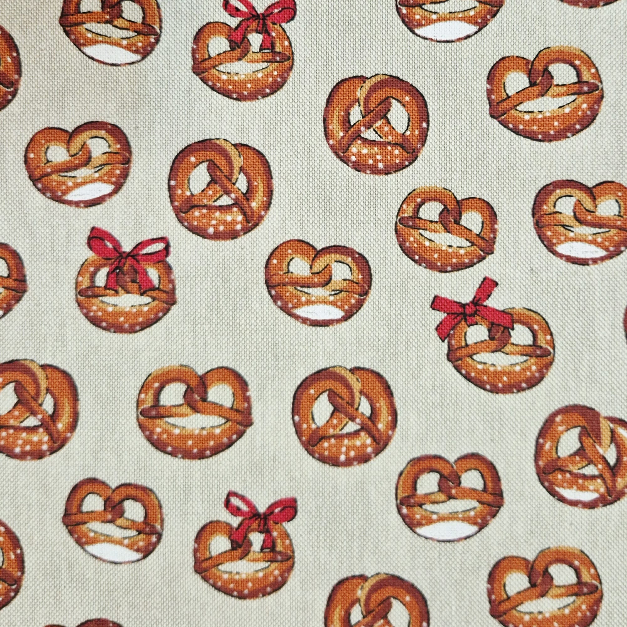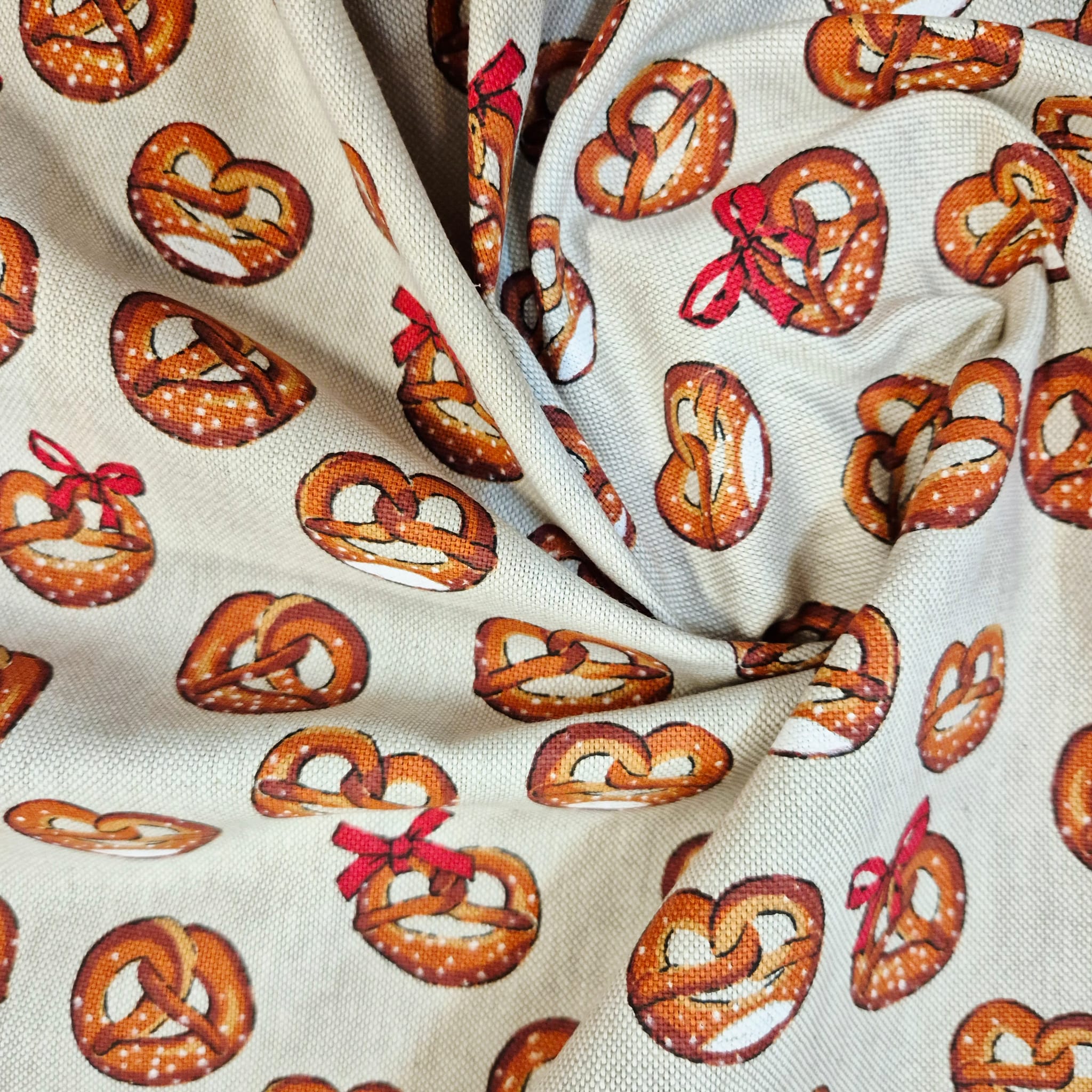 Der Preis gilt je 1/2 Laufmeter ( 0,5m Länge x 1,40 m Breite ) Baumwoll-Mischgewebe, einseitig bedruckt mit köstlichen Brezeln. Ein toller, robuster Stoff mit einem appetitlichen Motiv!