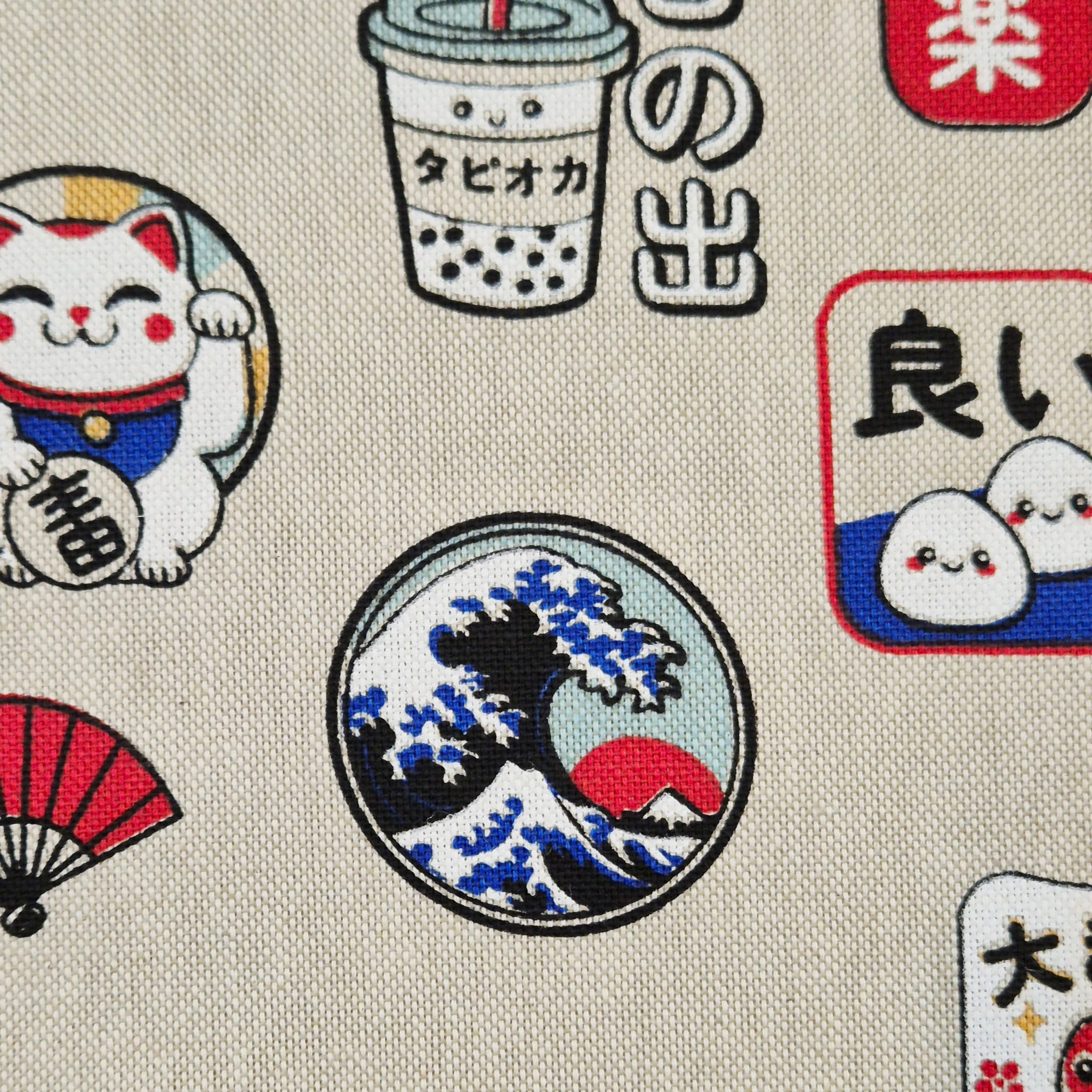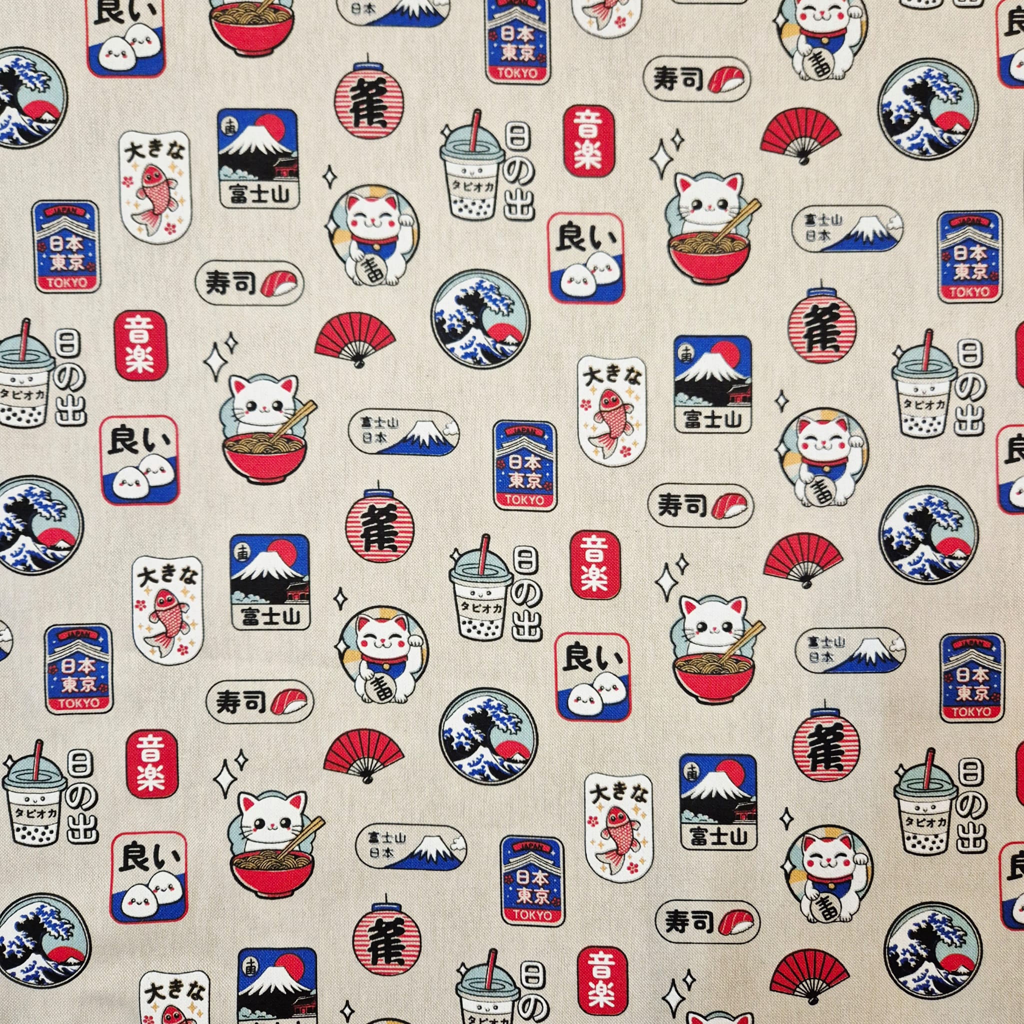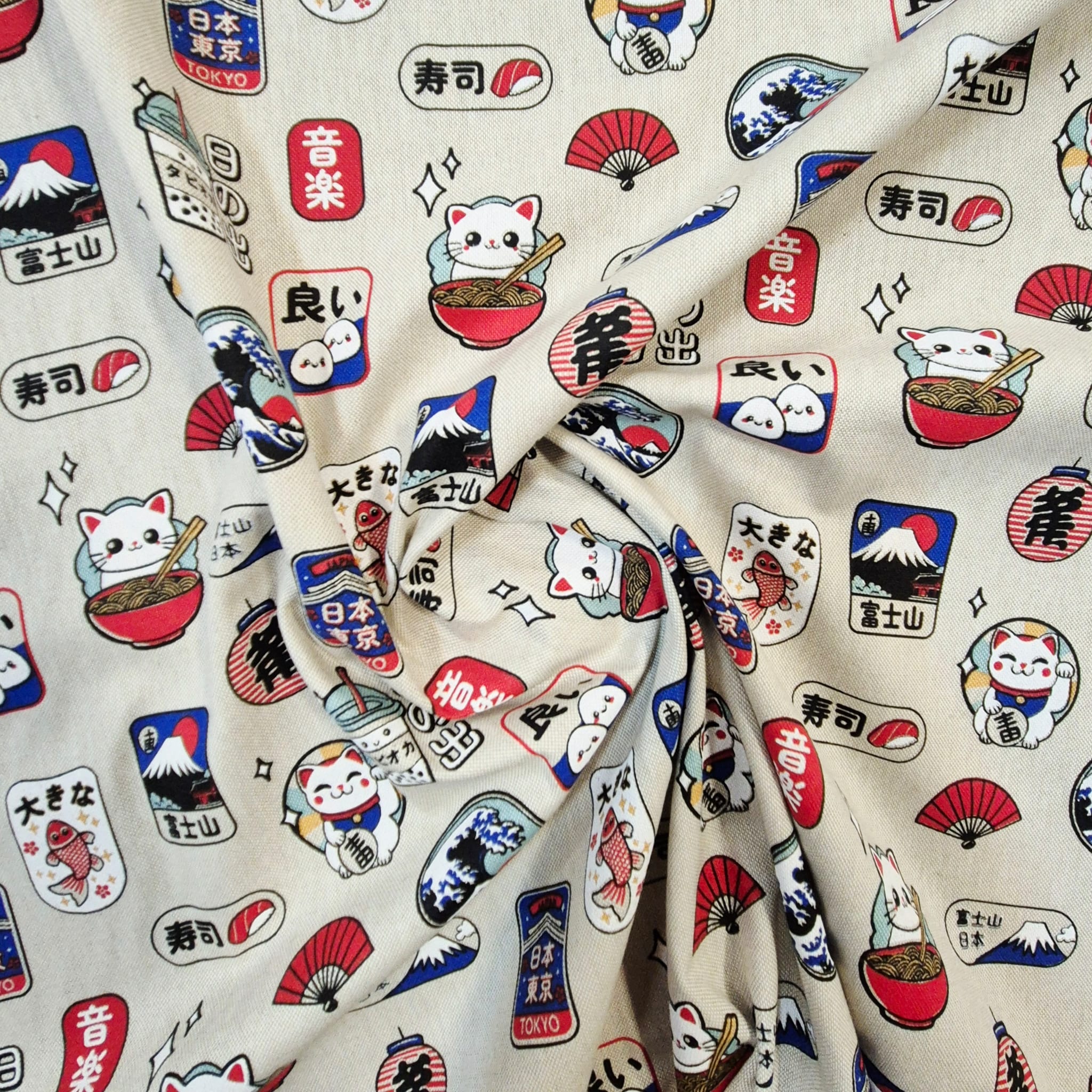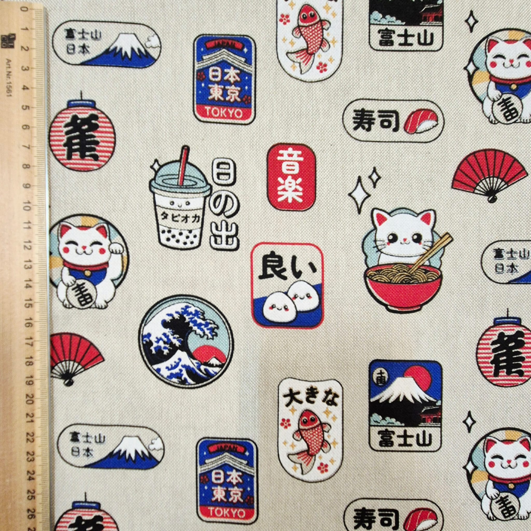 Der Preis gilt je 1/2 Laufmeter ( 0,5m Länge x 1,40 m Breite ) Baumwoll-Mischgewebe, einseitig bedruckt mit unterschiedlichen, typisch japanischen Motiven. Ein toller, robuster Stoff für Alle, die Japan lieben!