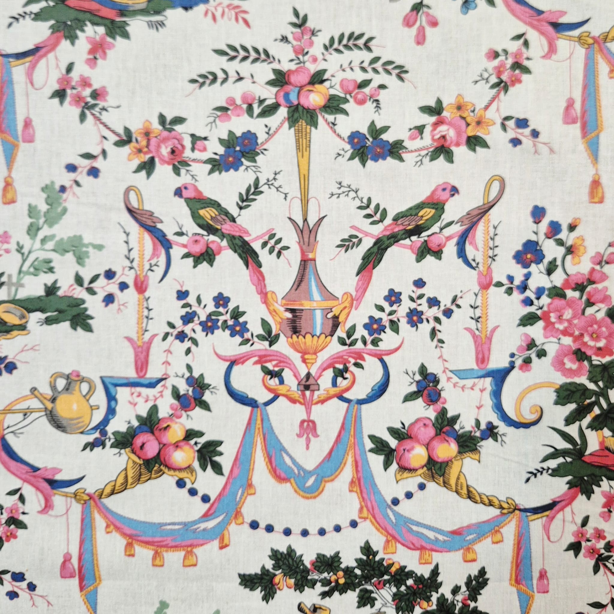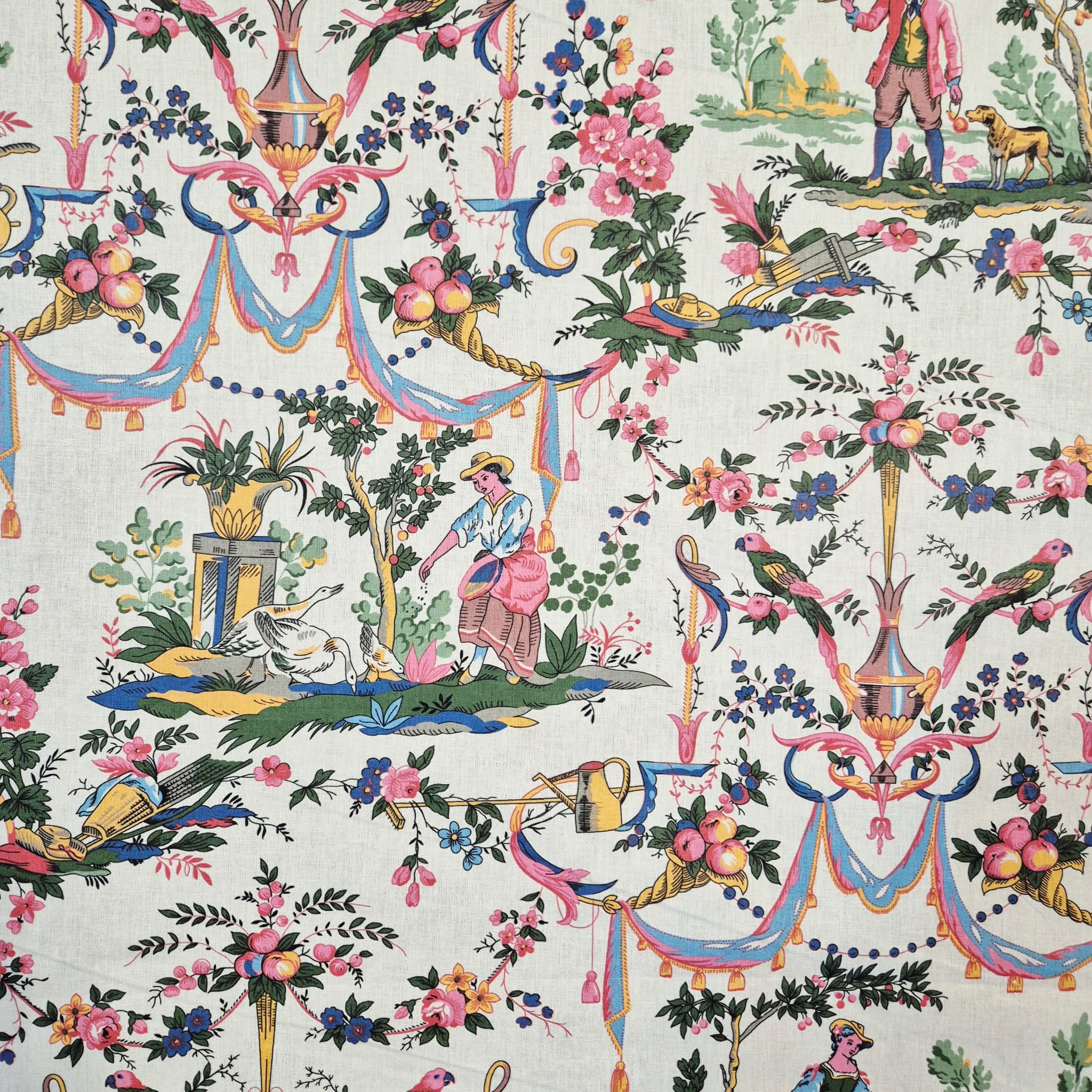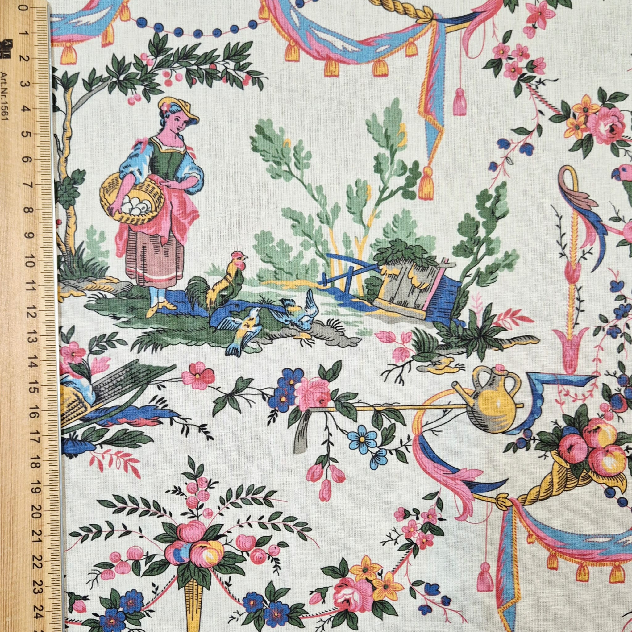 Der Preis gilt je 1/2 Laufmeter (0,5 m Länge x 1,40 m Breite) Baumwollstoff, einseitig bedruckt mit einem klassischen Toile de Jouy Motiv in wunderschönen Farben auf hell ecrufarbenem Fond. Die Verspieltheit des Morives kommt auf der zarten geschintzten Baumwolle bsonders gut zur Geltung.