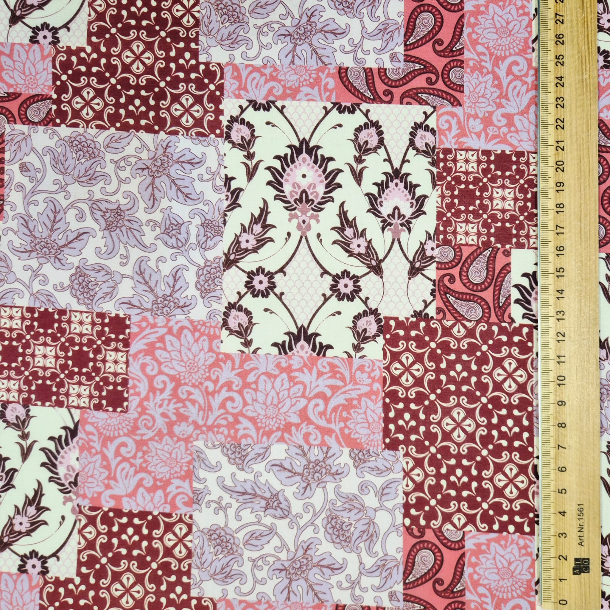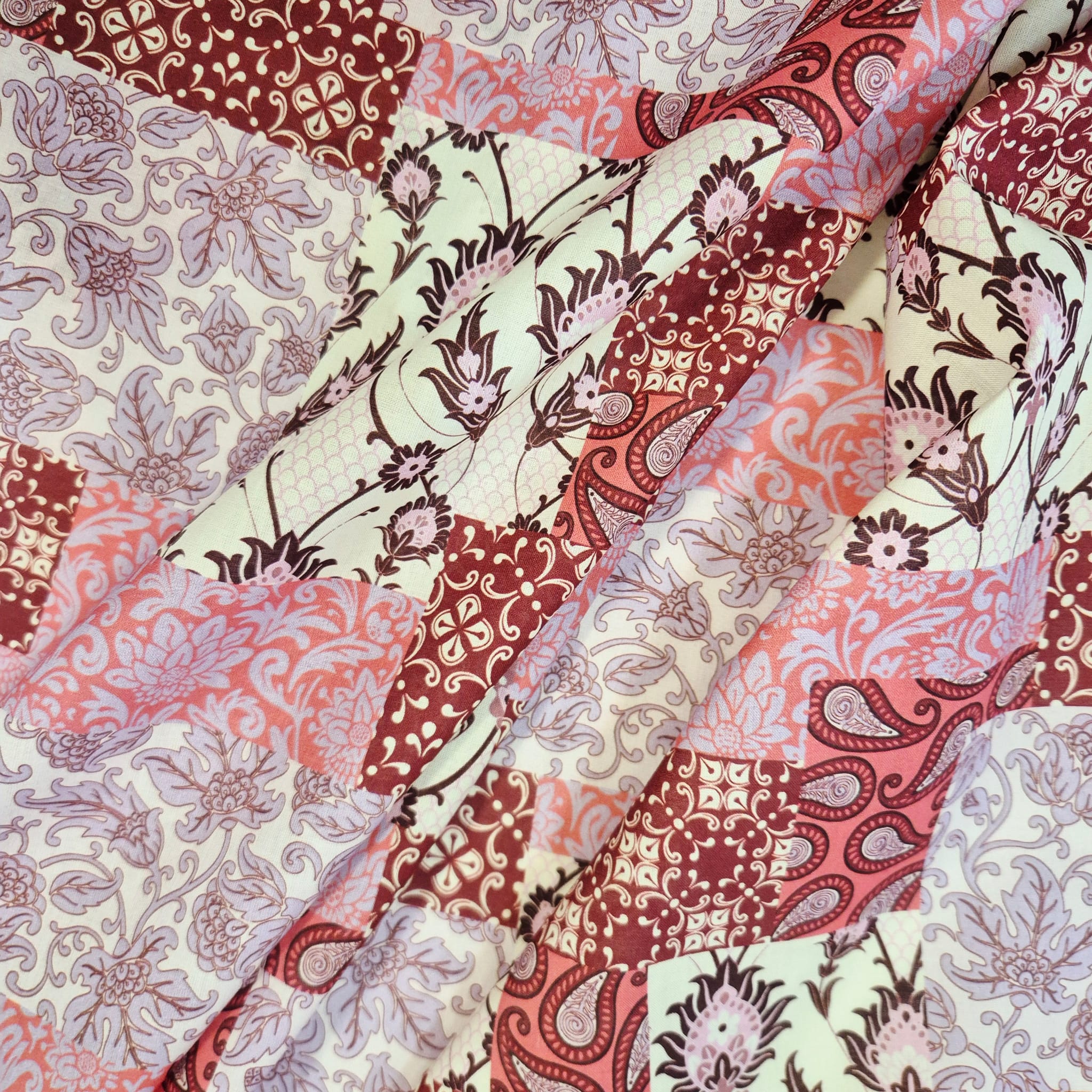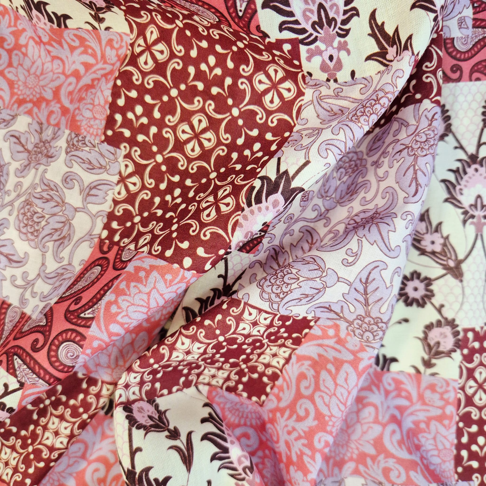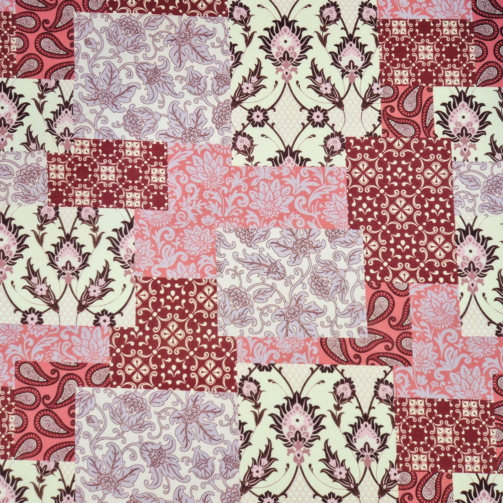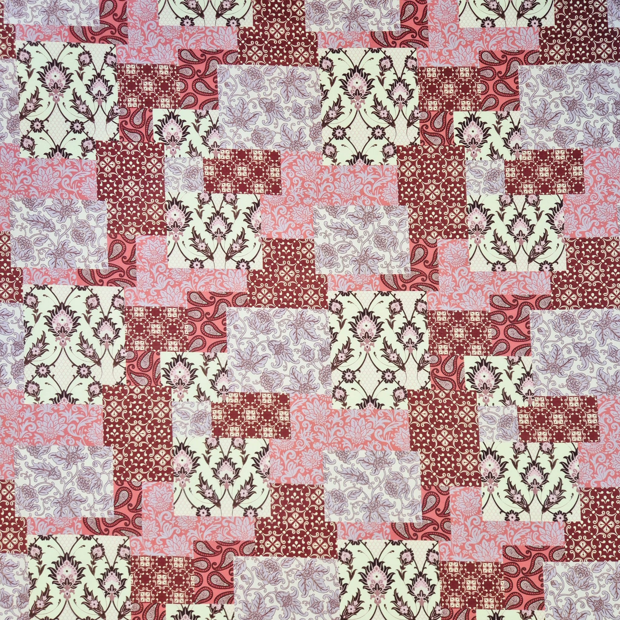 Der Preis bezieht sich auf 1/2 Laufmeter (0,5 m Länge x 1,40 m Breite) leichten Baumwollstoff, einseitig bedruckt mit einem Patchworkmuster in verschiedenen Rot und Rosatönen. Der Mustermix aus provencalischen und indischen Motiven wirkt super lässig und und kreiert den typischen Ibiza-Hippie-Style.