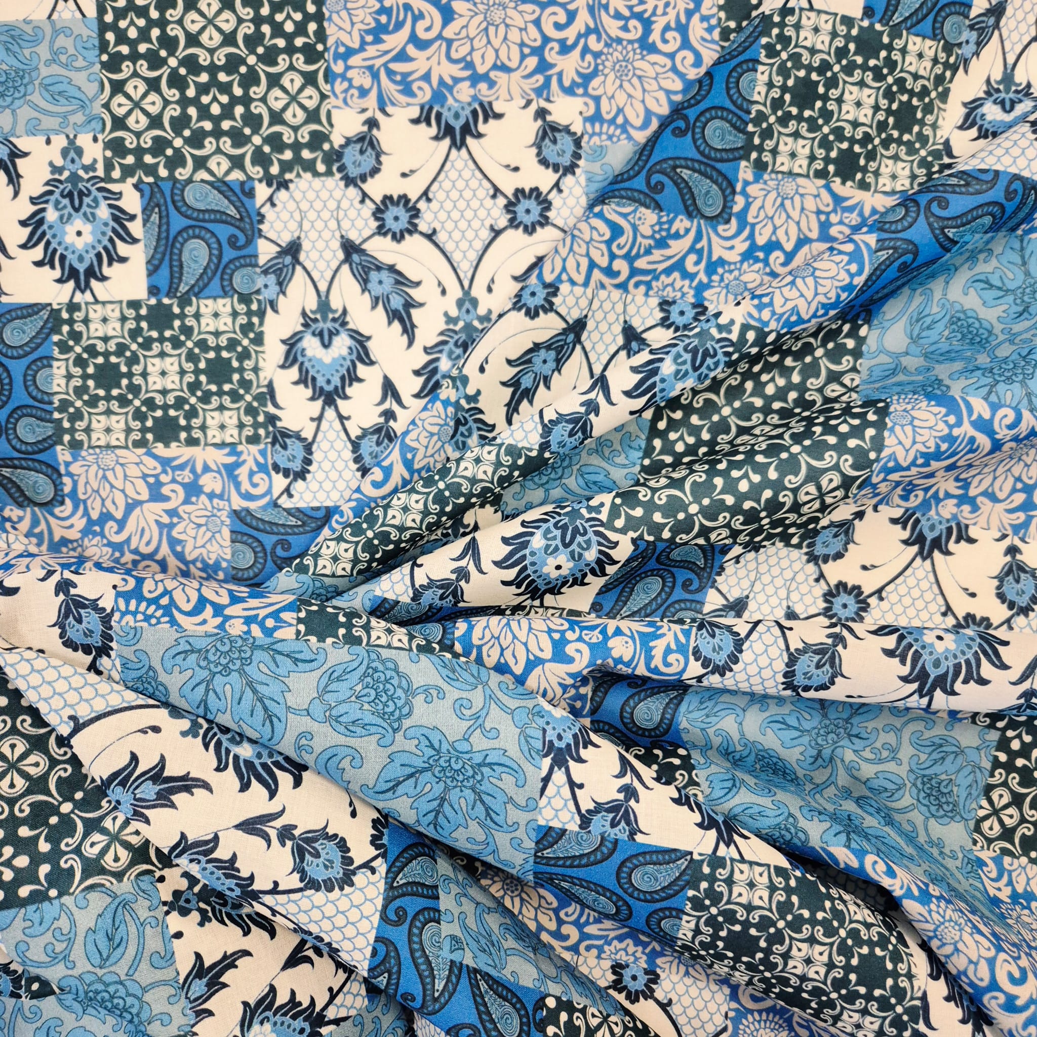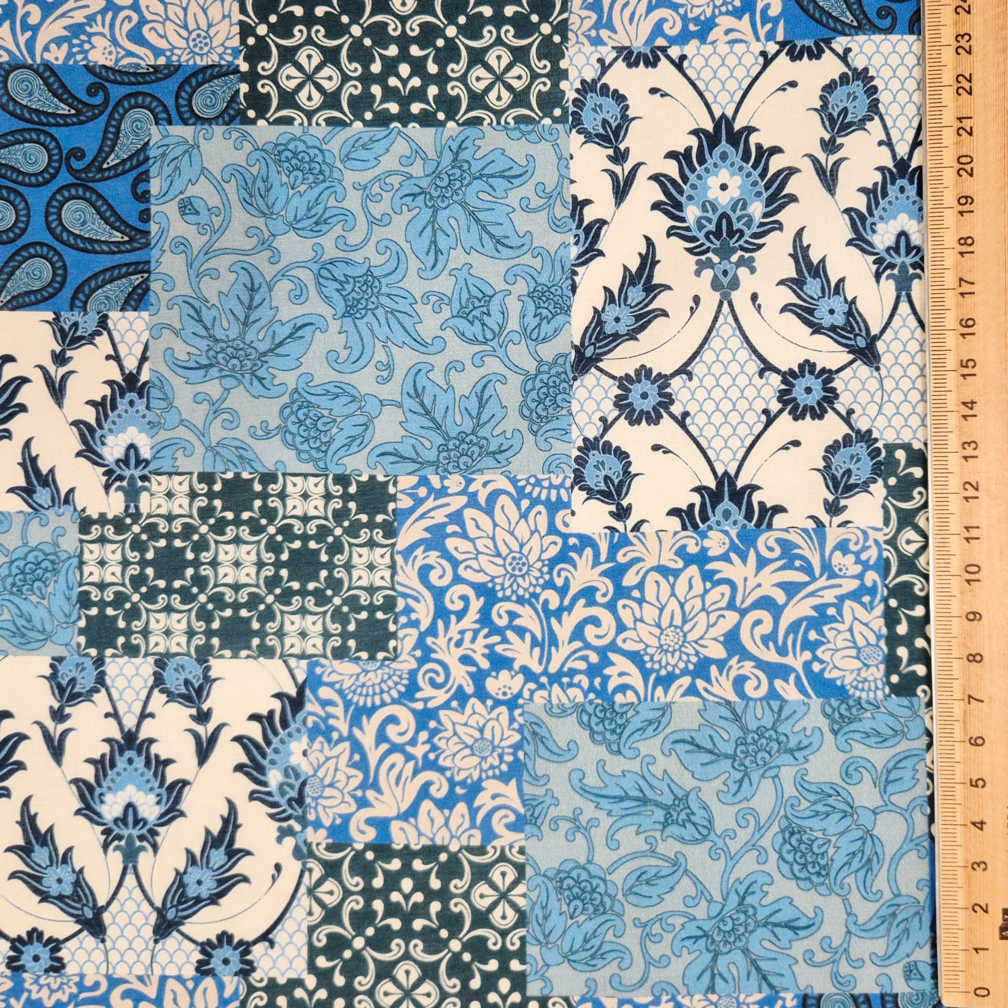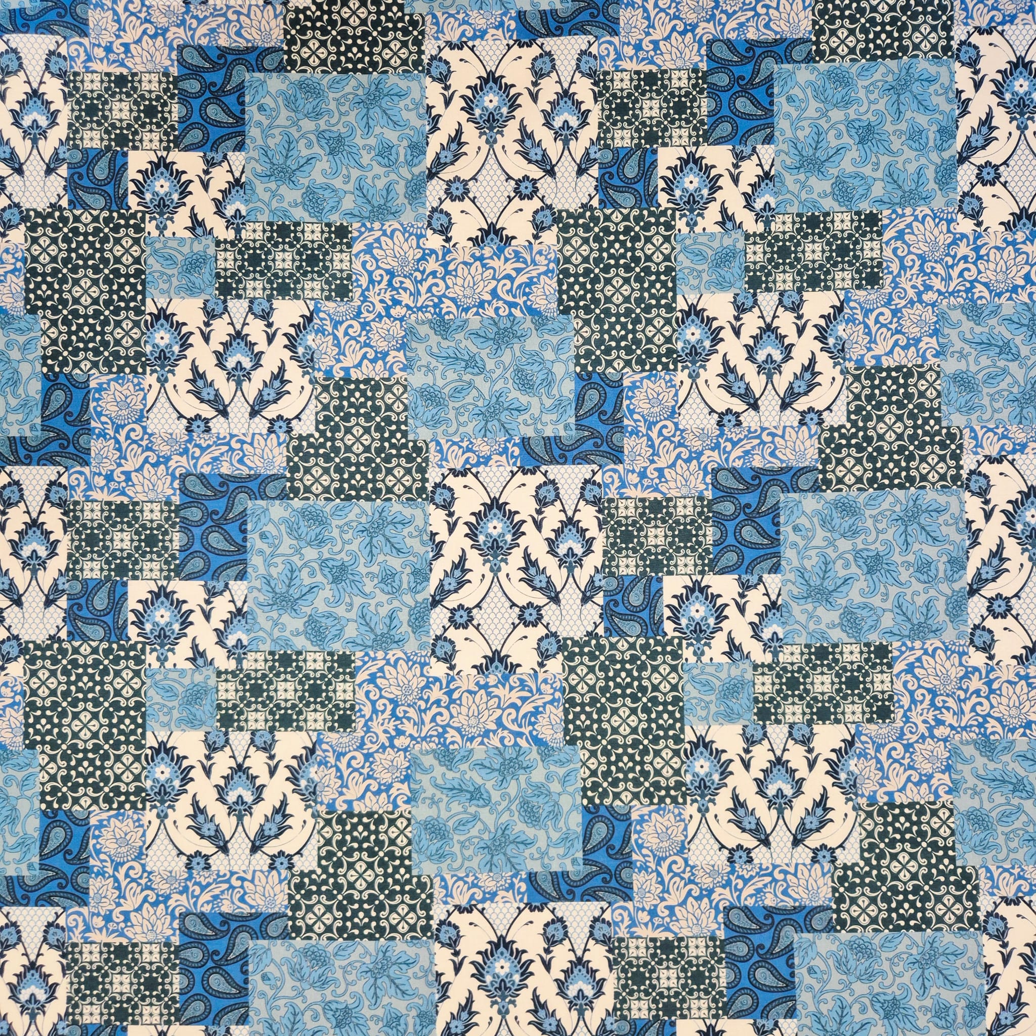 Der Preis bezieht sich auf 1/2 Laufmeter (0,5 m Länge x 1,40 m Breite) leichten Baumwollstoff, einseitig bedruckt mit einem Patchworkmuster in verschiedenen Blau und Petroltönen. Der Mustermix aus provencalischen und indischen Motiven wirkt super lässig und und kreiert den typischen Ibiza-Hippie-Style.