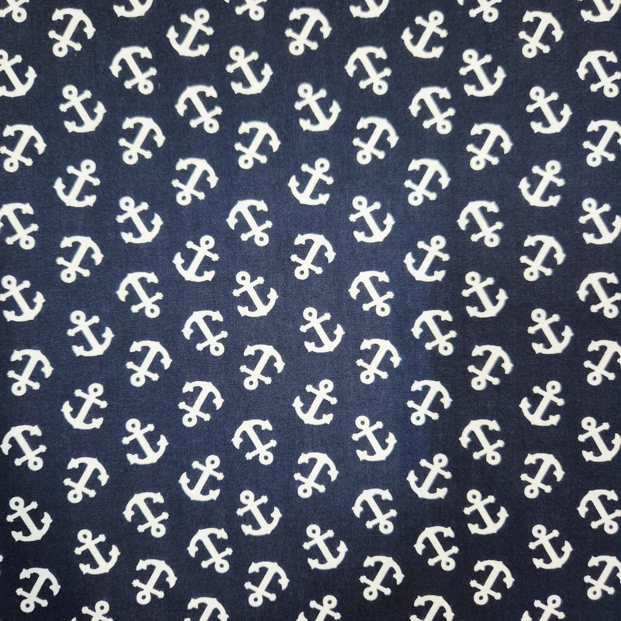 Der Preis gilt je 1/2 Laufmeter (0,5m Länge x 1,45 m Breite) Baumwollstoff, einseitig bedruckt mit weissen Ankern auf dunkelblauem Fond . Ein klassisches Motiv für kleine und große Seefahrer/innen. Ökotex100