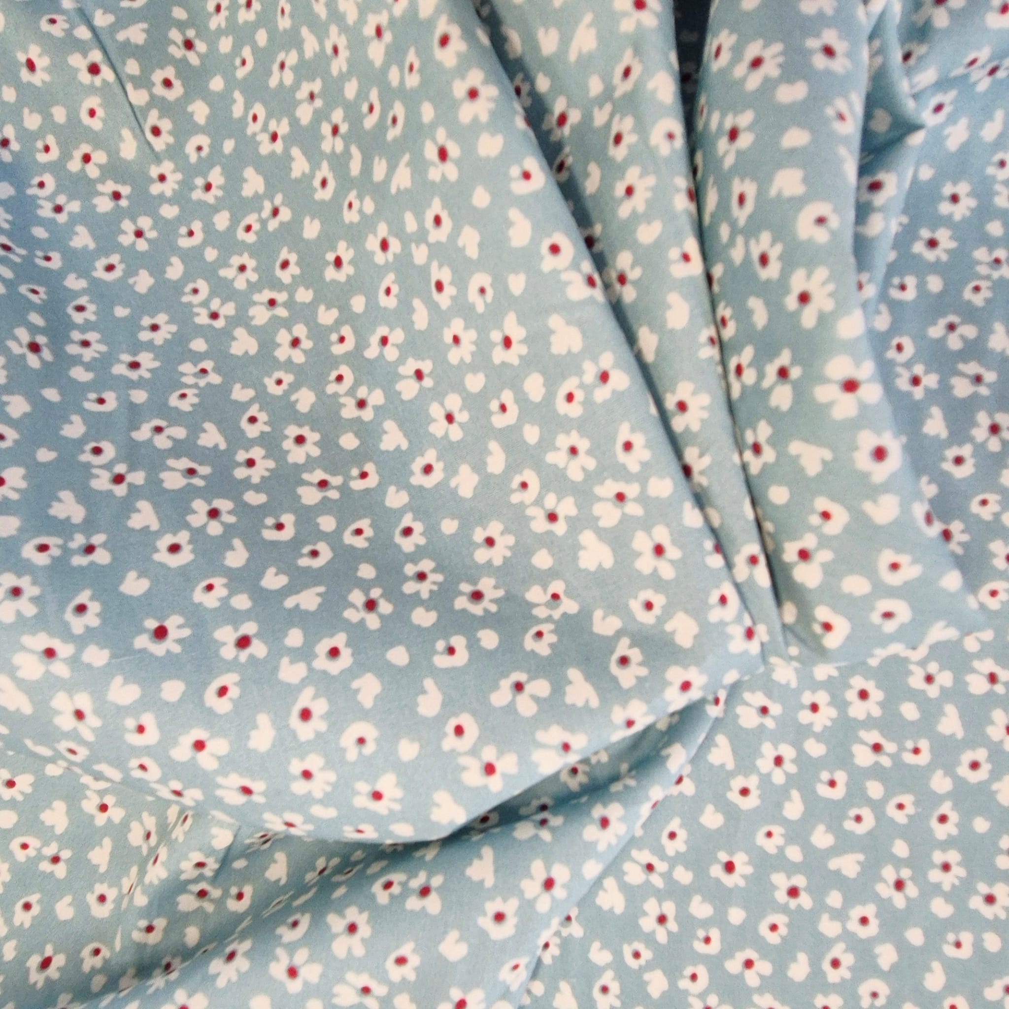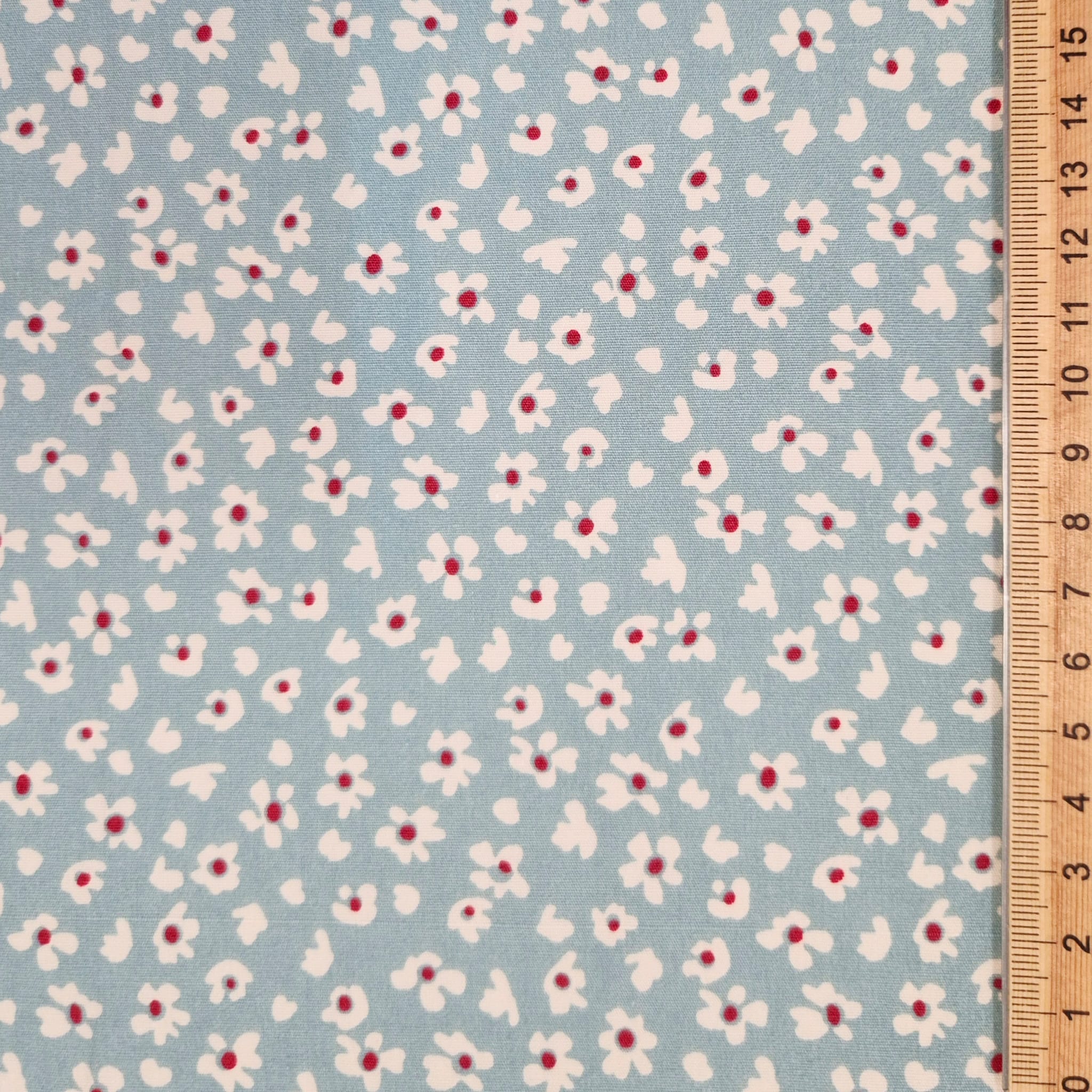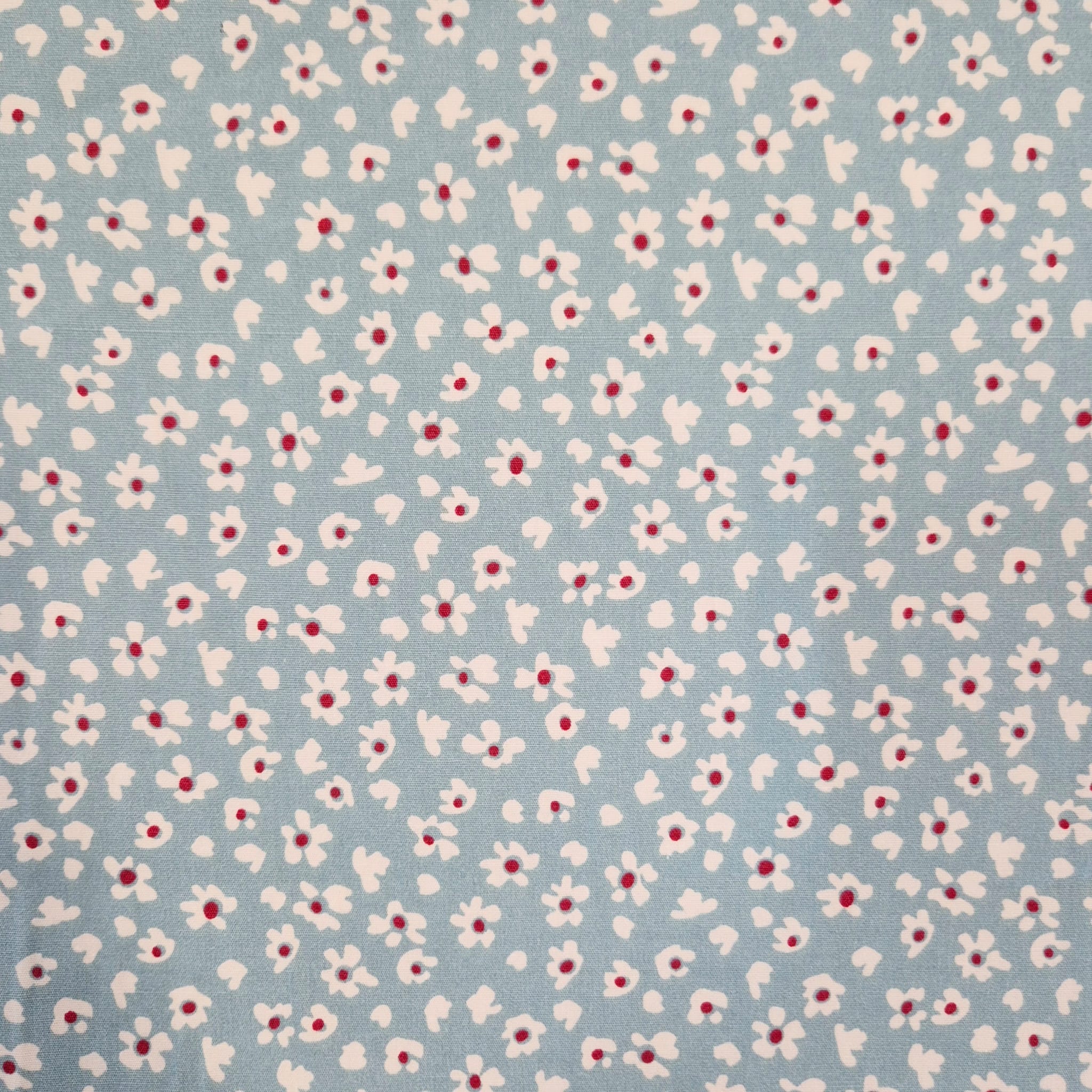 Der Preis gilt je 1/2 Laufmeter (0,5m Länge x 1,45 m Breite) Baumwollstoff, einseitig bedruckt mit weissen/roten Miniblümchen auf himmlblauem Fond . Die süssen Streublumen kommen einfach nie aus der Mode. Ökotex100