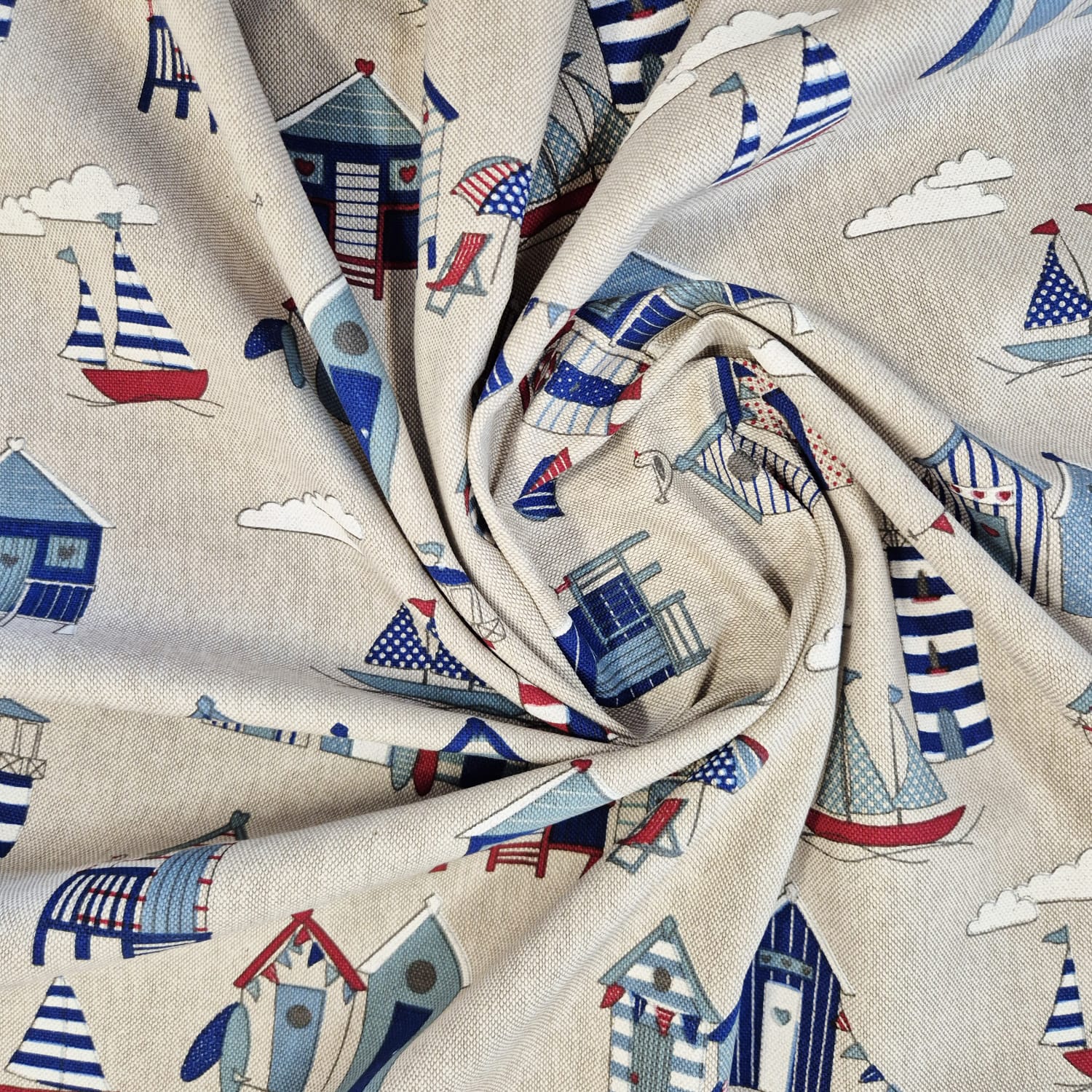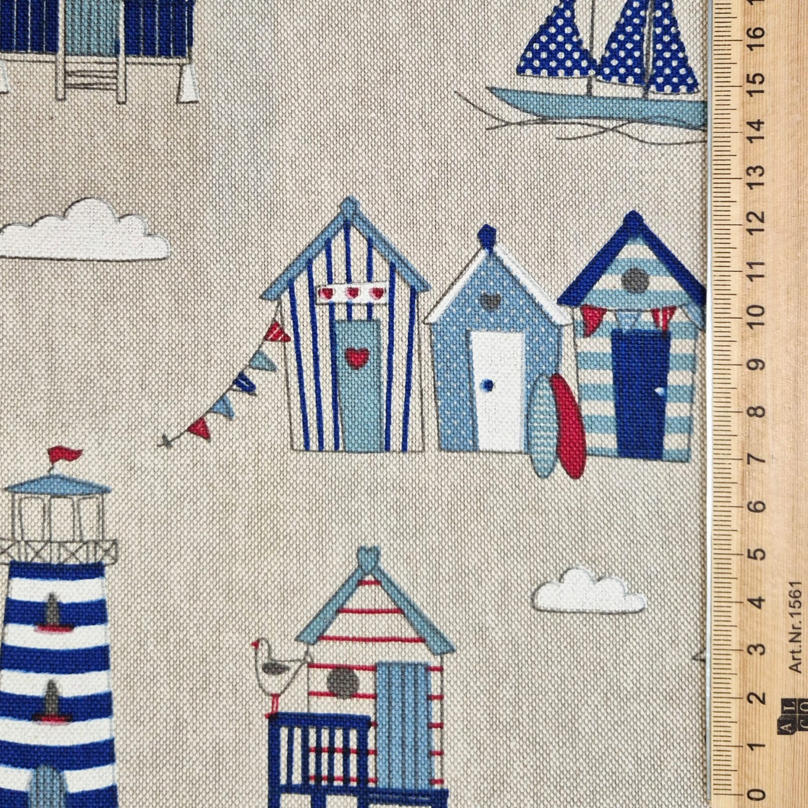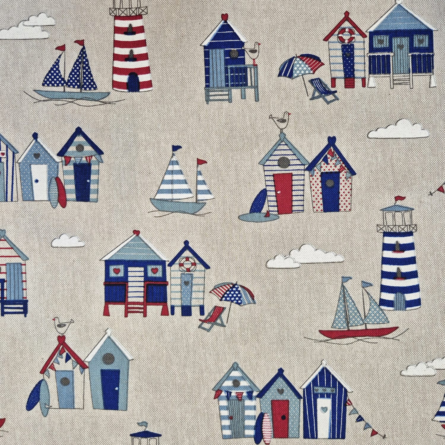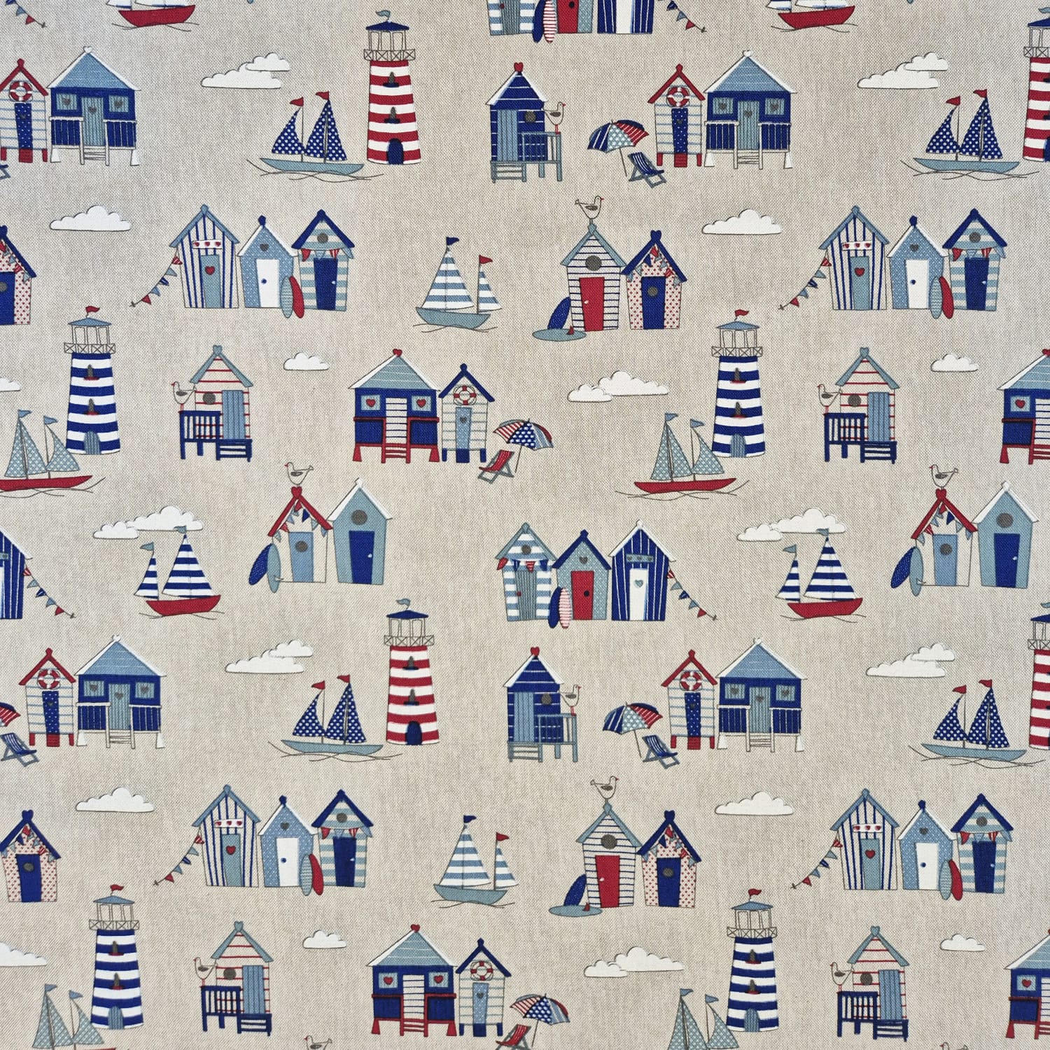 Der Preis gilt je 1/2 Laufmeter (0,5 m Länge x 1,40 m Breite ) Baumwoll-Mischgewebe, einseitig bedruckt mit verschiedenen maritimen Motiven wie Strandkabinen und Leuchttürmen auf naturfarbenem Fond. Ein wunderschönes Dessin für Alle, die Lust auf Strandurlaub haben.