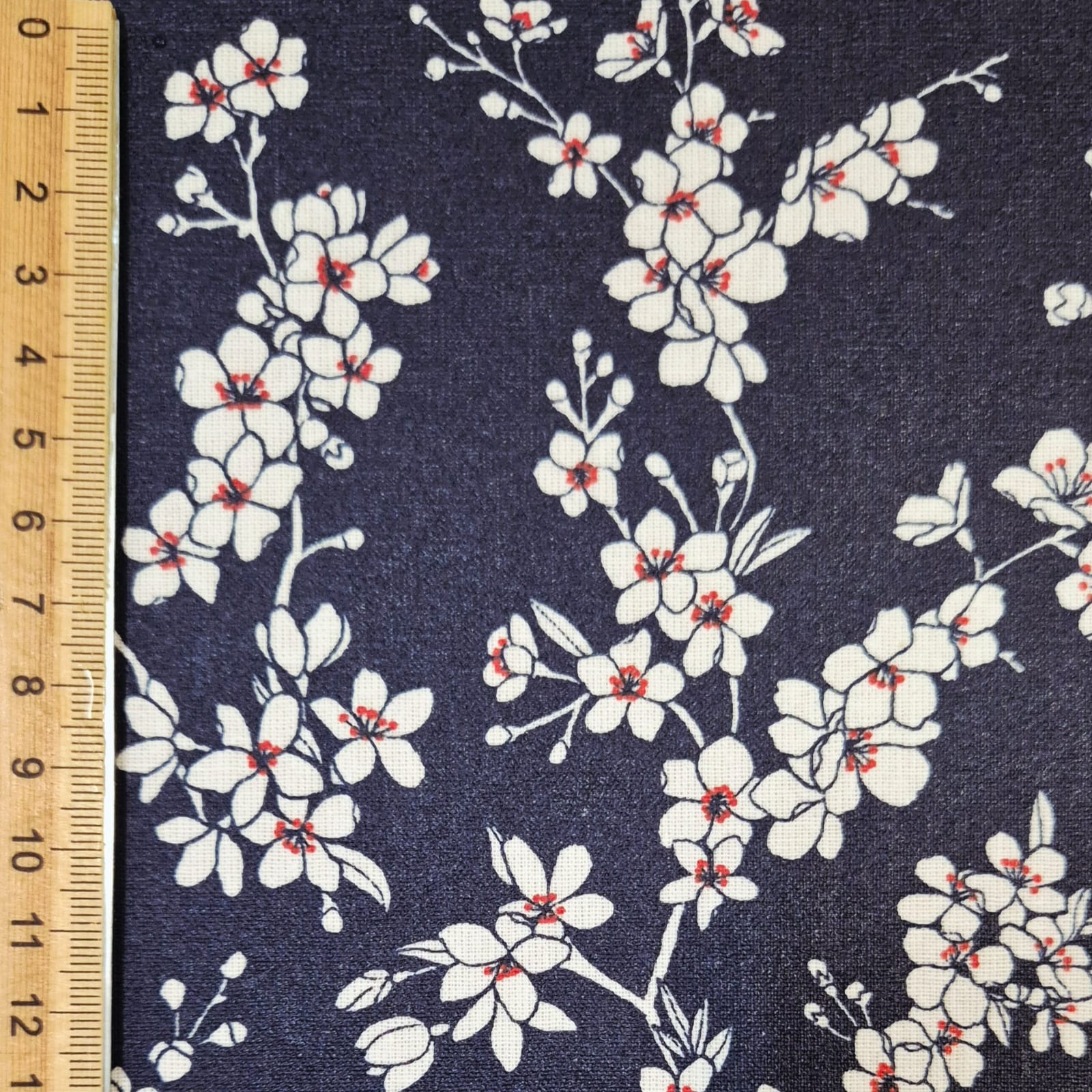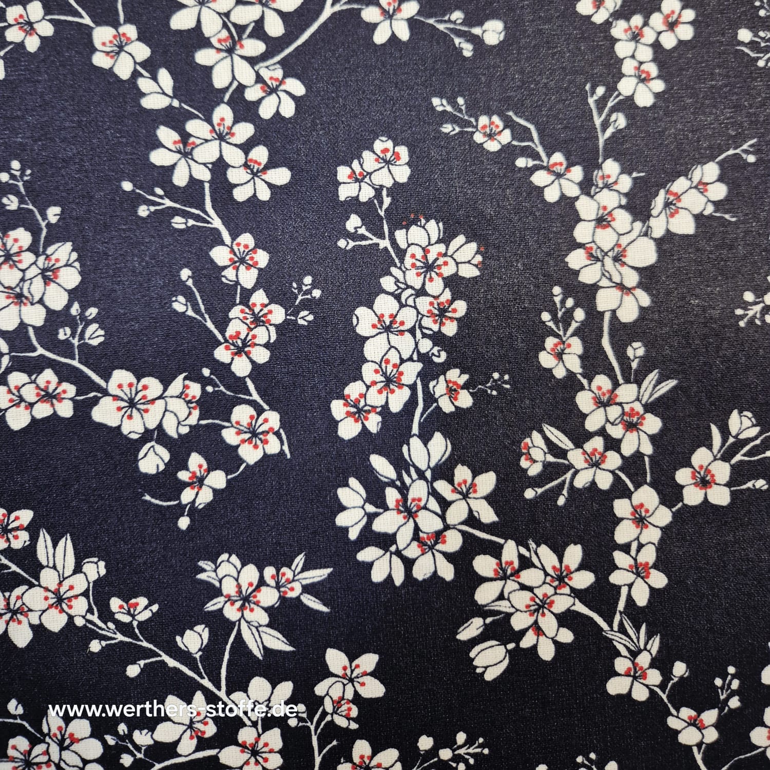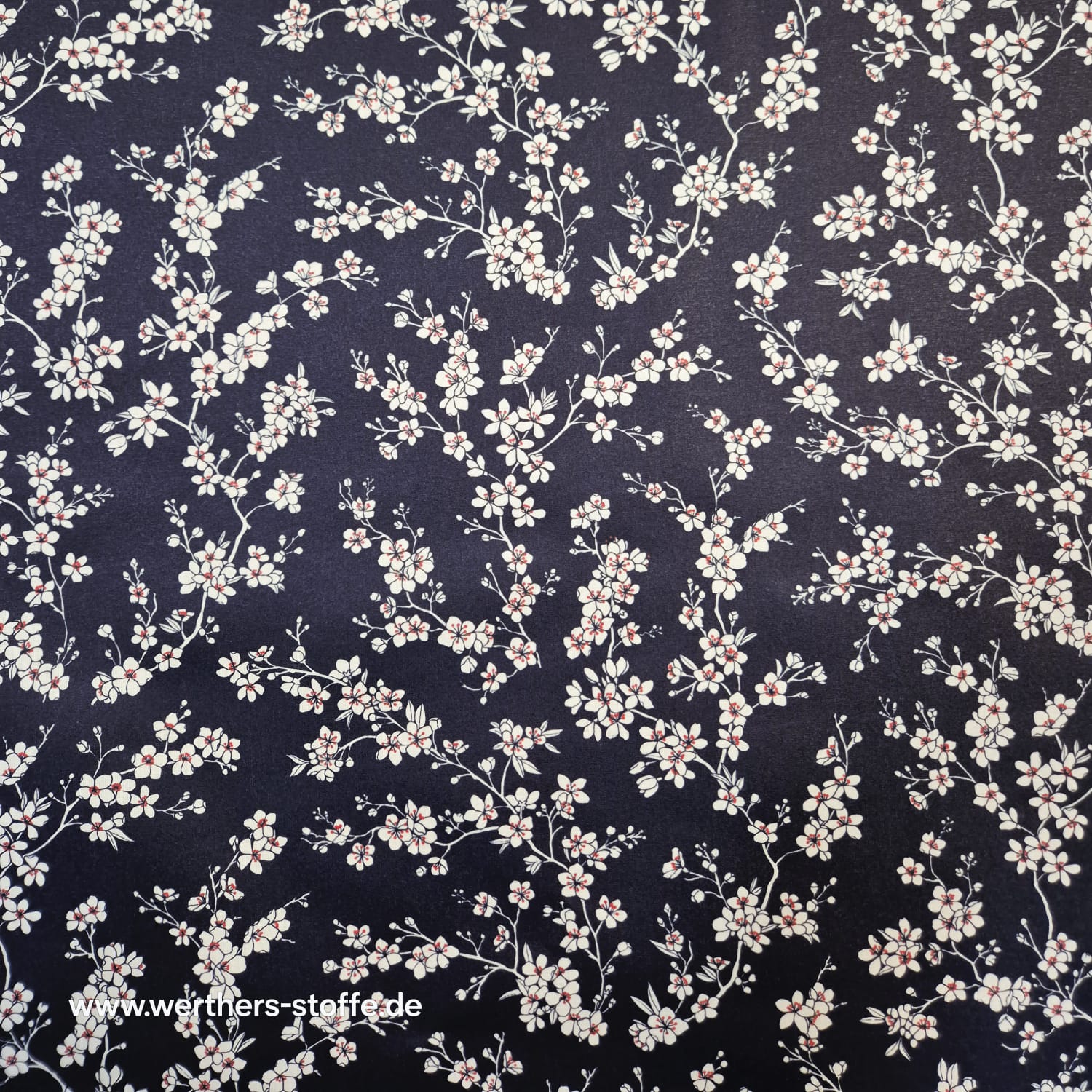 Mit dem französischen Baumwollstoff „Osaka“ holst du dir die Eleganz Japans direkt an die Nähmaschine! Das zarte Kirschblütenmuster auf dunkelblauem Grund erinnert an einen Spaziergang durch blühende Gärten – klassisch, stilvoll und zeitlos schön.