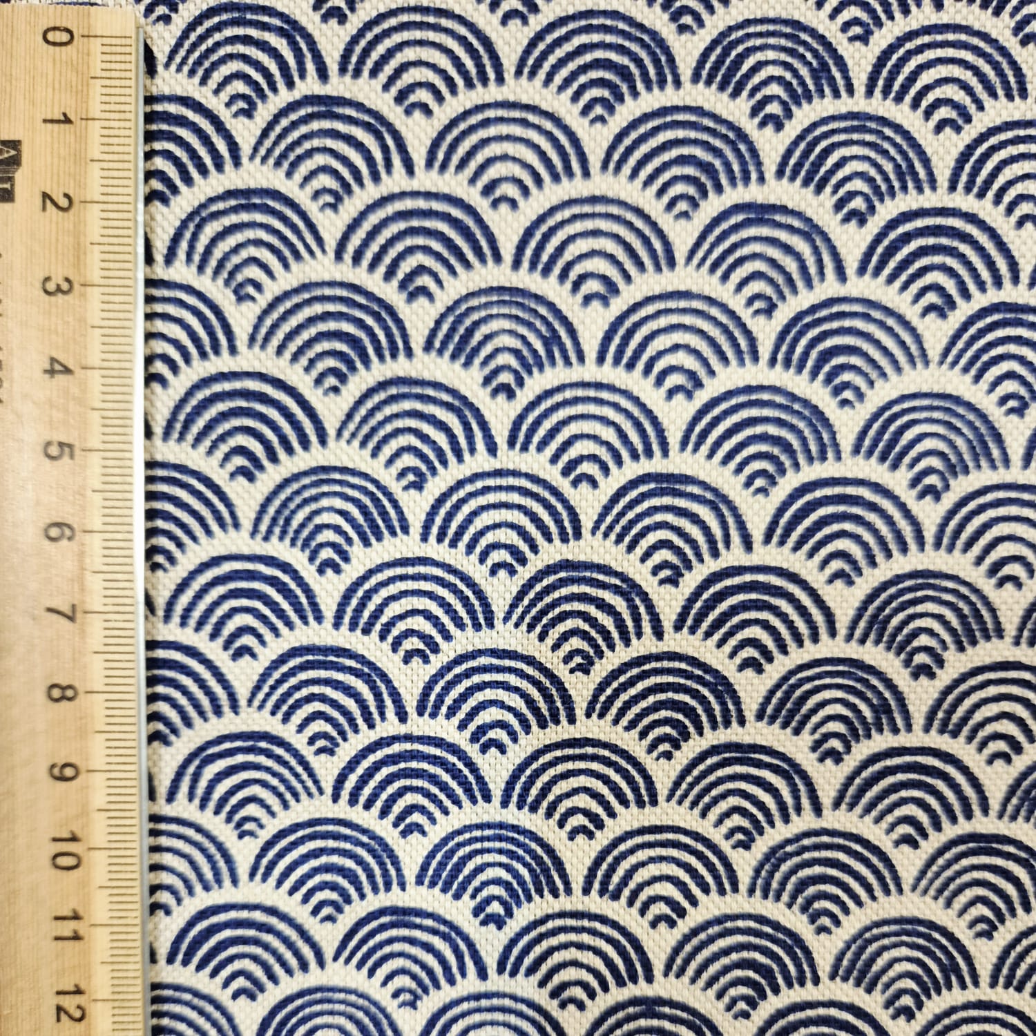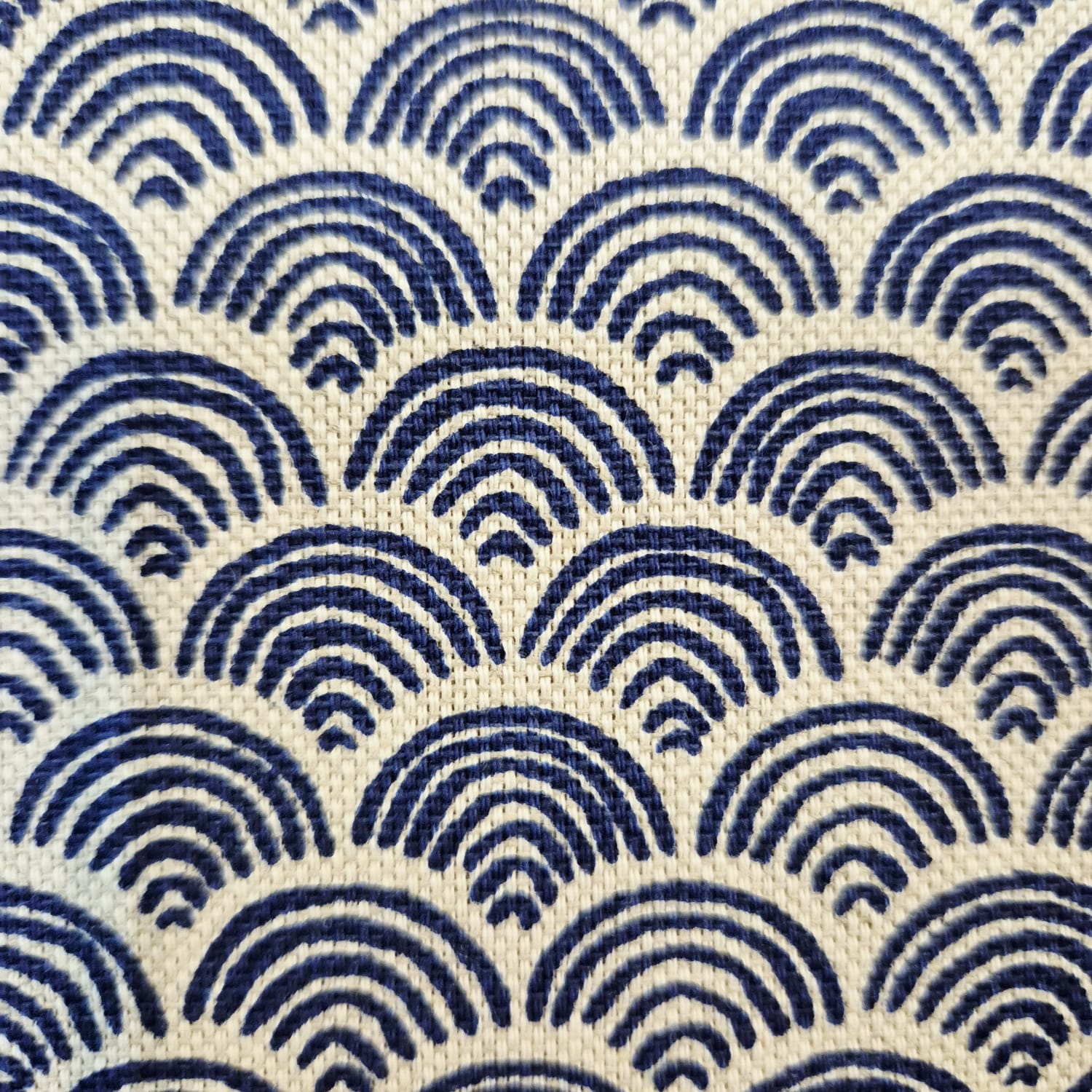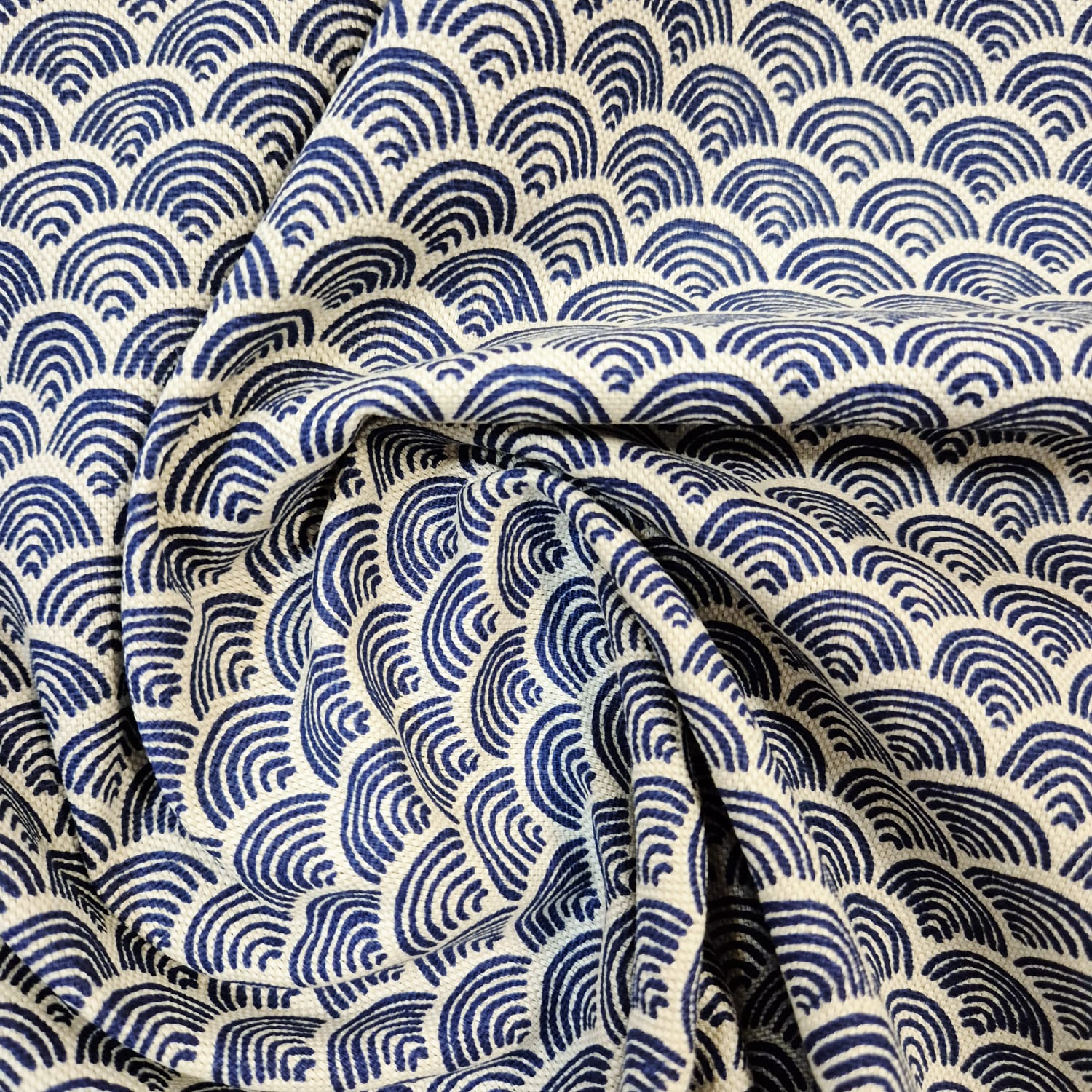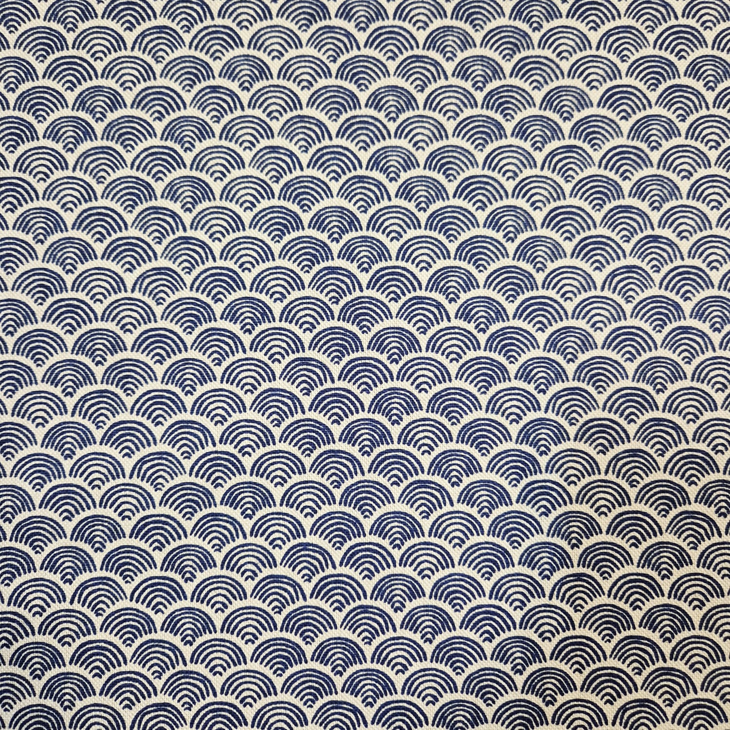 Der Preis gilt je 1/2 Laufmeter (0,5 m Länge x 1,40 m Breite ) Baumwoll-Mischgewebe, einseitig bedruckt mit einem klassischen japanischen Kimonomuster (Seigaiha), in kräftigem Tintenblau, auf naturfarbenem Fond. Ein wunderschönes schlichtes und doch ausdrucksstarkes Dessin.
