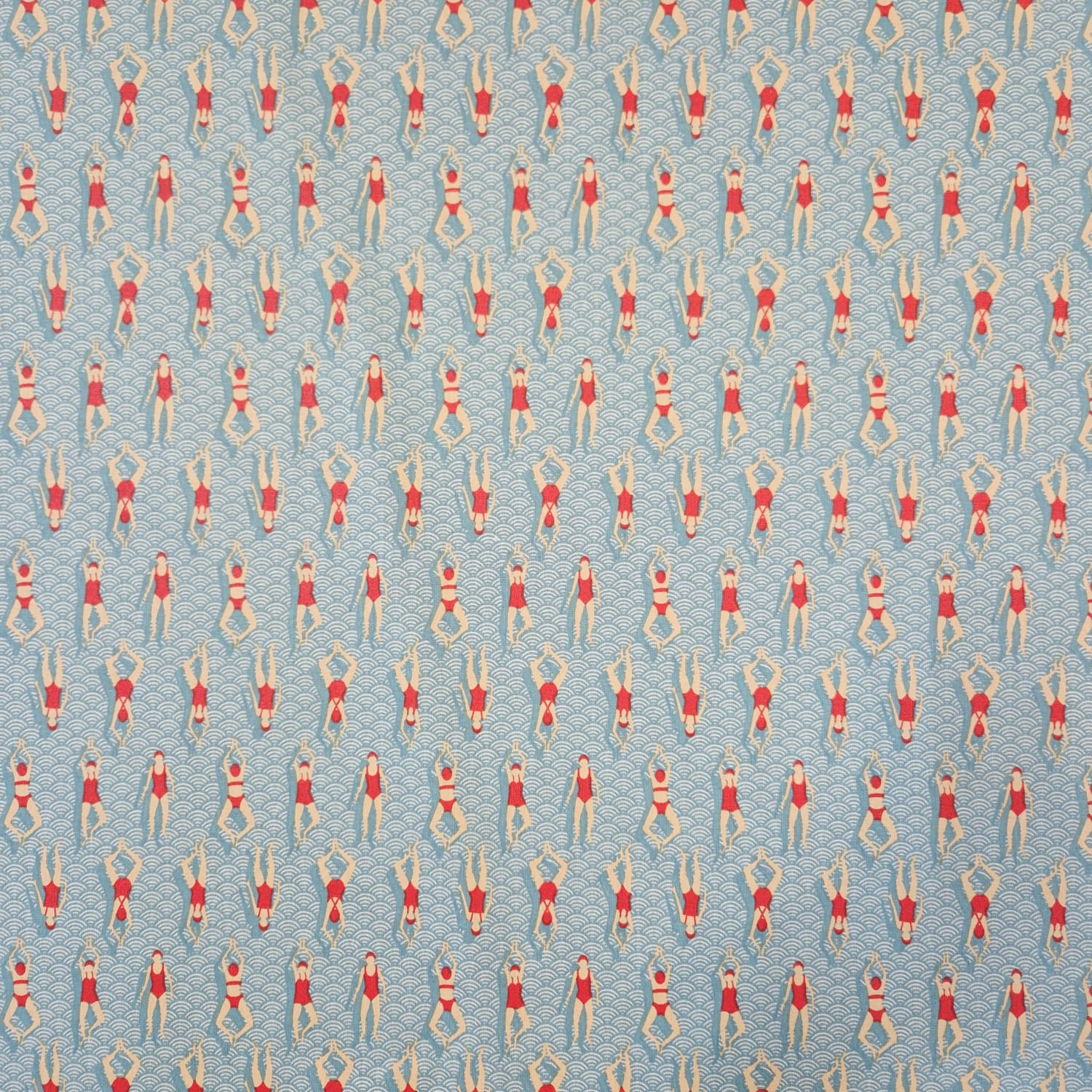 Der Preis bezieht sich auf 1/2 Laufmeter (0,5 m Länge x 1,56 m Breite) beschichteten Baumwollstoff, einseitig bedruckt mitmit Schwimmerinnen in roten Badeanzügen in türkisfarbenen Wellen.