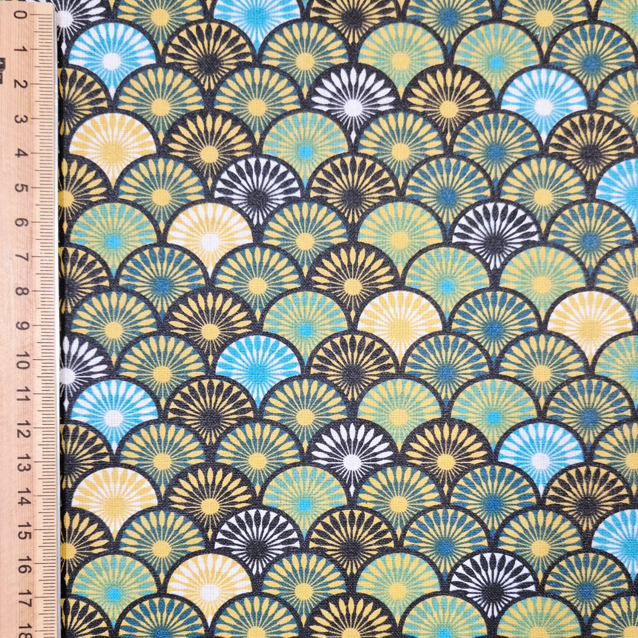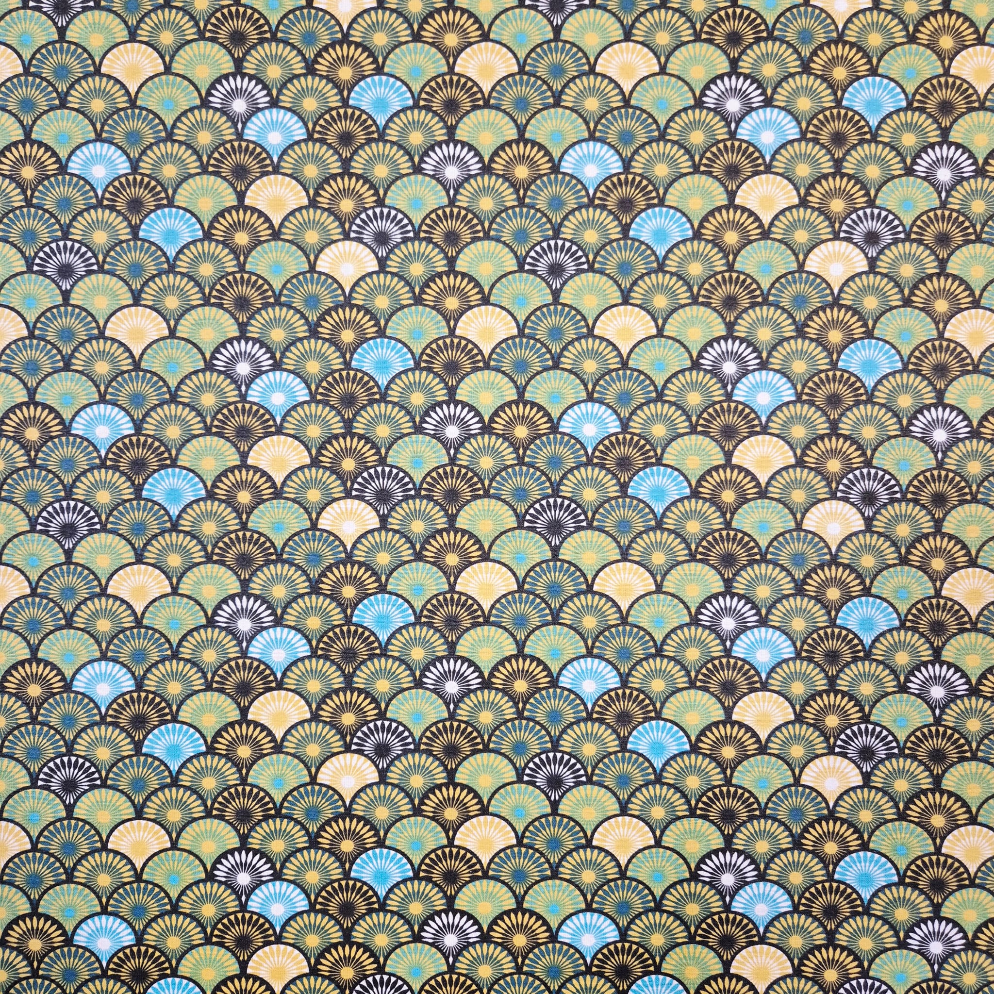 Der Preis bezieht sich auf 1/2 Laufmeter (0,5 m Länge x 1,56 m Breite) beschichteten Baumwollstoff, einseitig bedruckt mit Kreisen/Fächern im Art-Deco Stil. Die passend aufeinander abgestimmten Blau-Grüntöne werden perfekt durch das Goldgelb ergänzt wodurch sich ein edler, zeitloser Look ergibt.