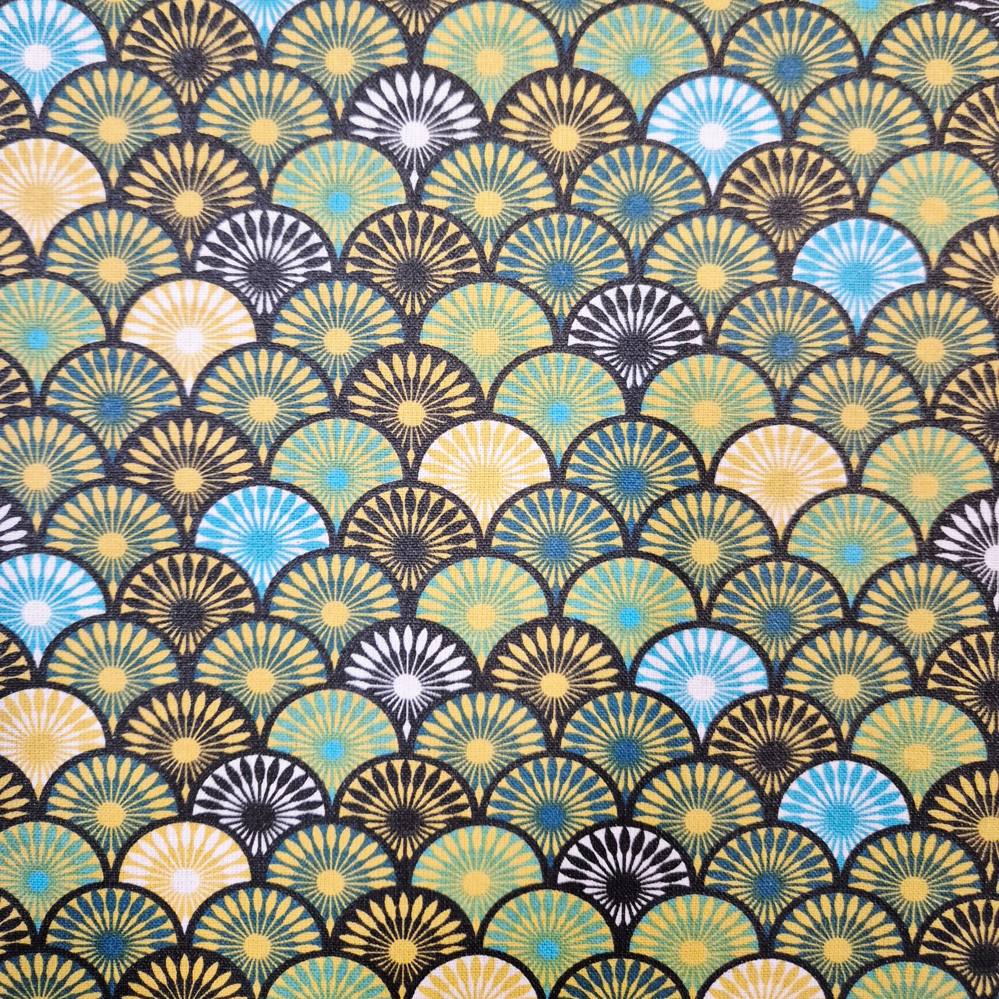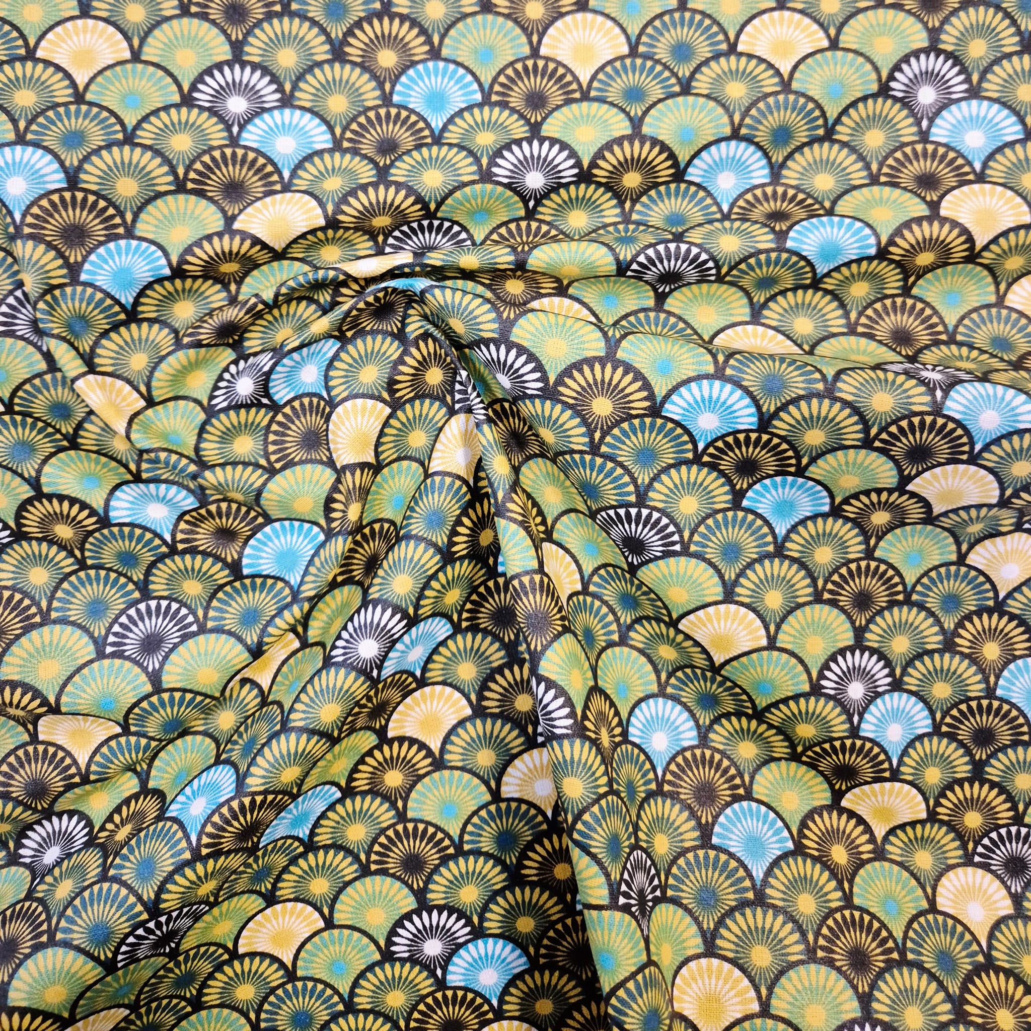 Stoff beschichtet Baumwolle "Suri" grün aqua petrol goldgelb Fächer wasserfest 0,5