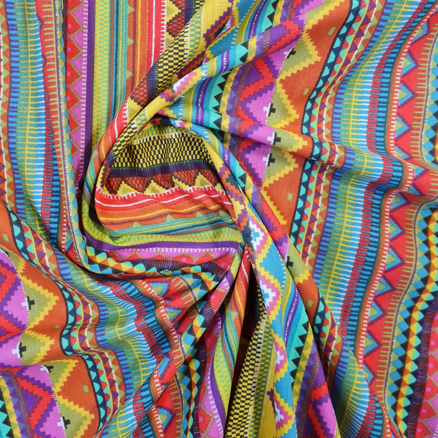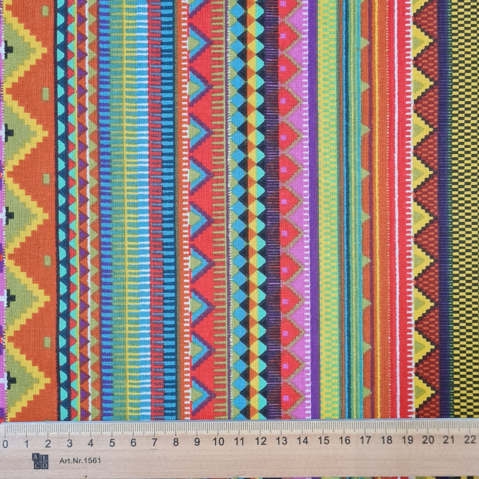 Der Preis bezieht sich auf 1/2 Laufmeter (0,5 m Länge x 1,56 m Breite) beschichteten Baumwollstoff, einseitig bedruckt mit knallbunten Zickzack Streifen. Ein toller, farbenfroher Hingucker für Alle, die es bunt lieben.