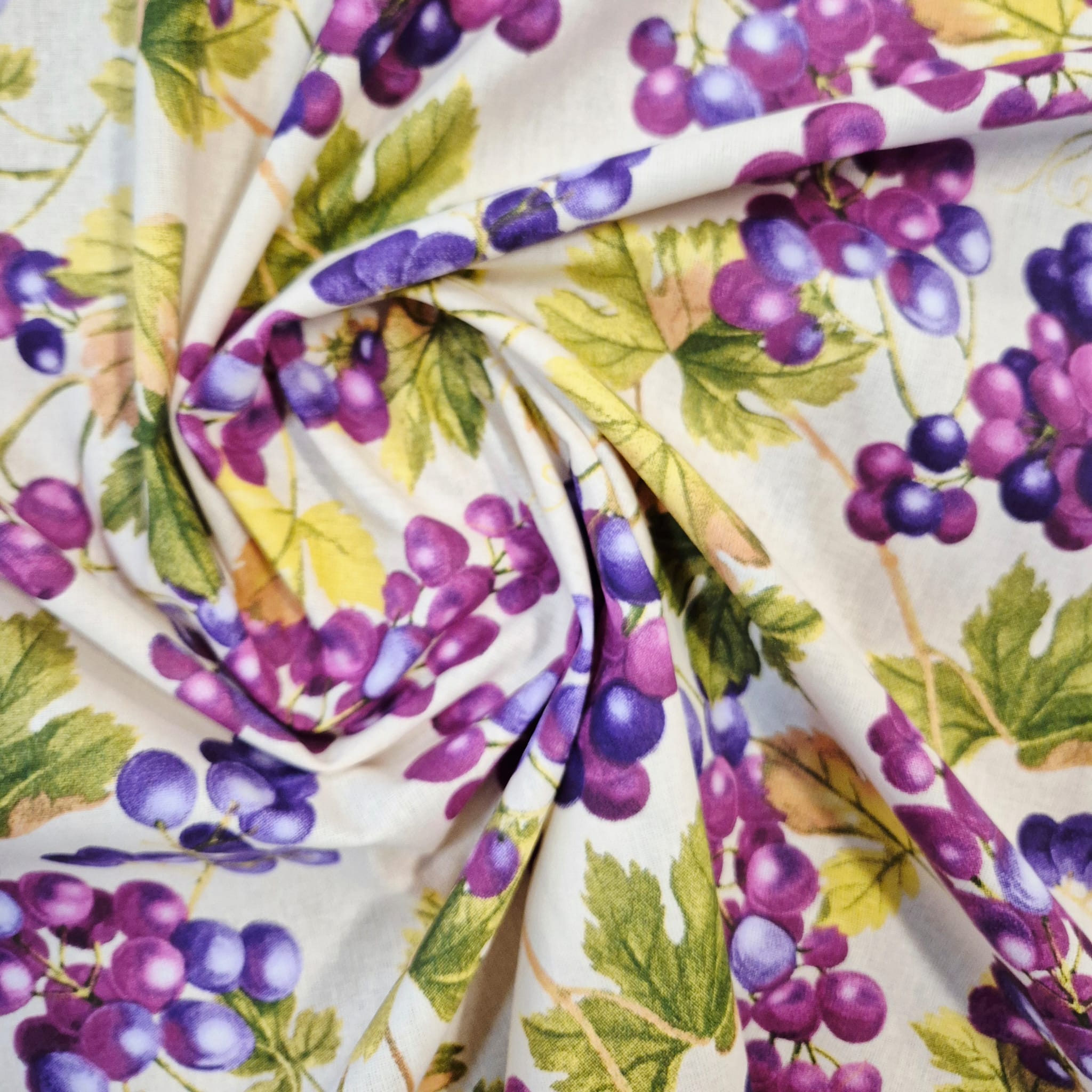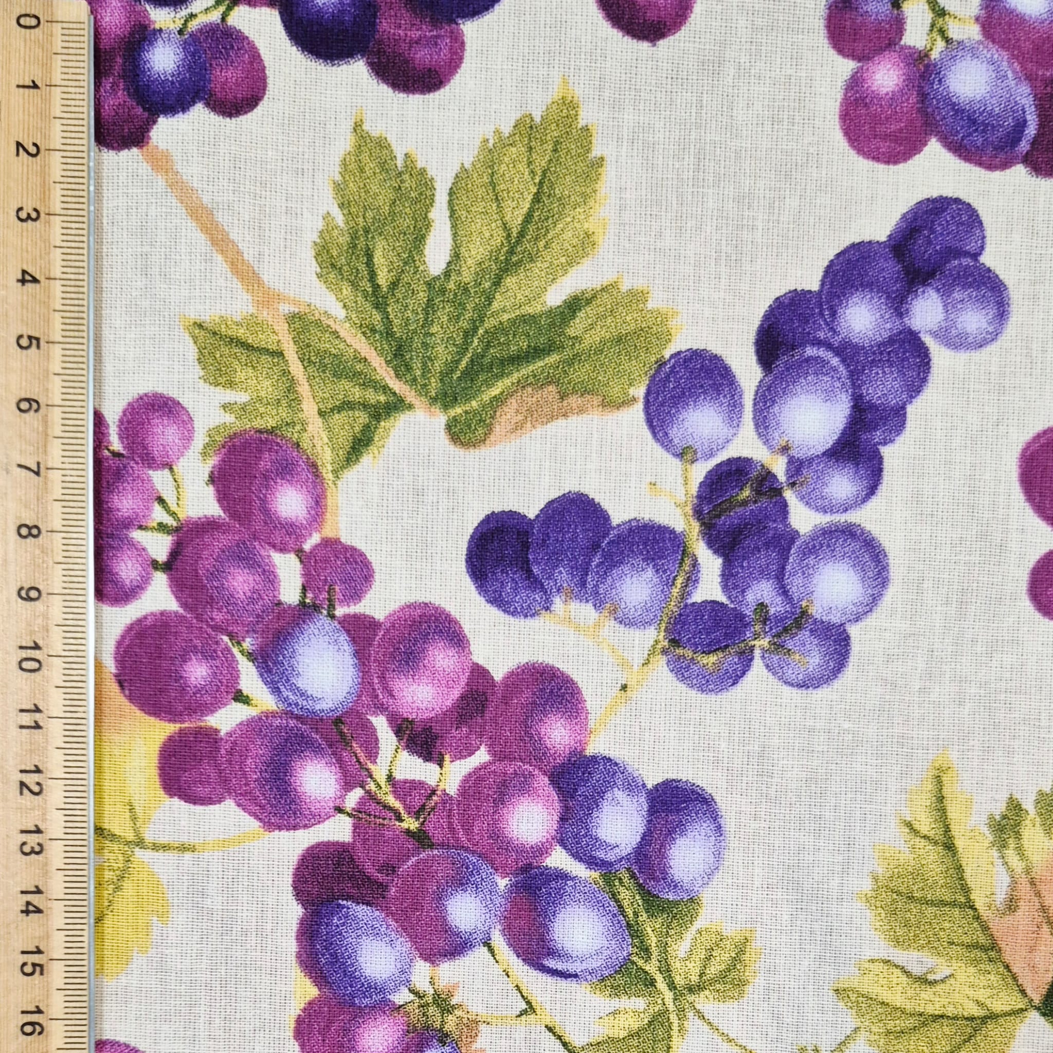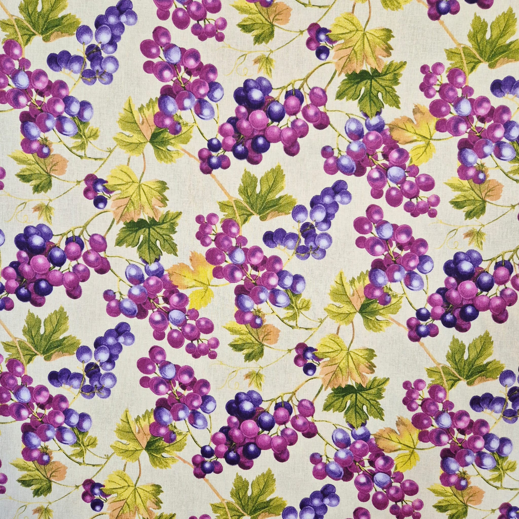 Der Preis gilt je 1/2 Laufmeter (0,5 m Länge x 1,60 m Breite) Baumwollstoff, einseitig bedruckt mit naturalistisch dargestellten Weintrauben. Ein wunderschöner, ausdrucksstarker Druck für alle Obst- und Weinfans.