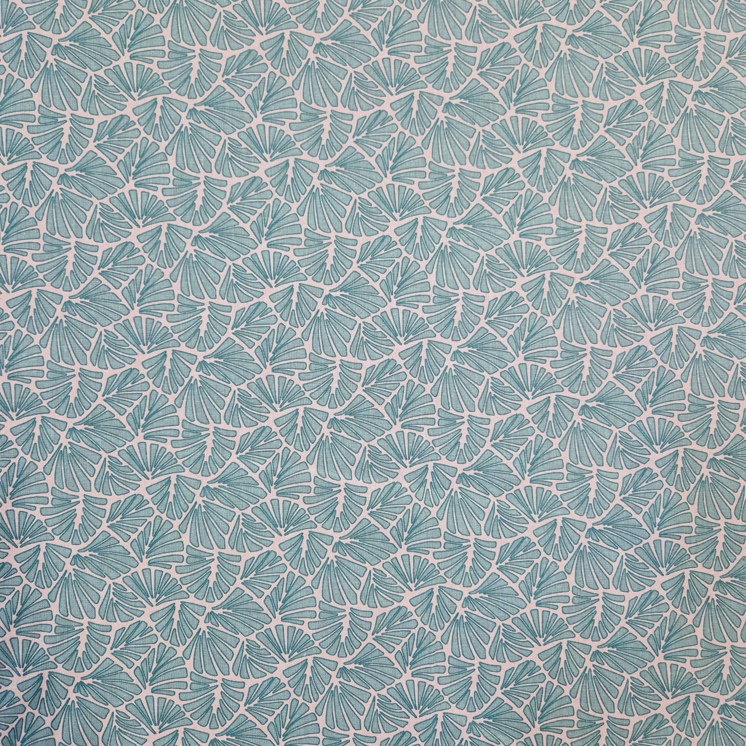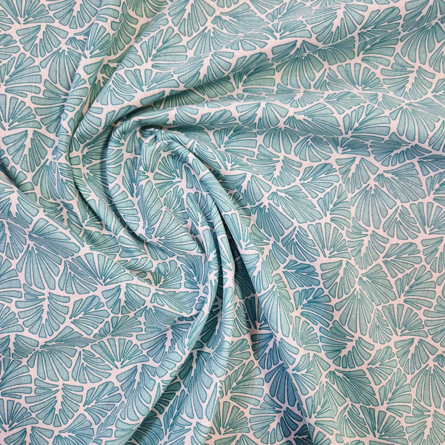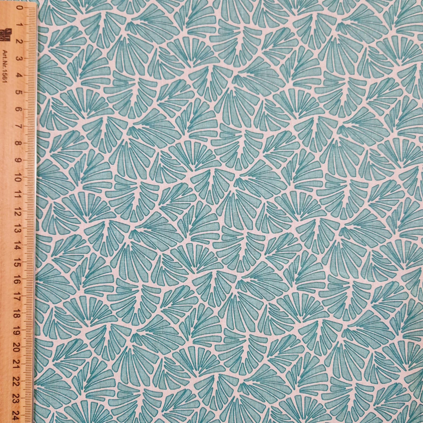 Verleihe deinen Nähprojekten einen frischen, modernen Look mit diesem hochwertigen Baumwollstoff mit türkisfarbenem Blättermuster. Das stilisierte, fächerartige Design erinnert an tropische Blätter und sorgt für ein lebendiges, aber dennoch harmonisches Erscheinungsbild. Der Stoff überzeugt durch seine weiche Haptik, hohe Strapazierfähigkeit und ausgezeichnete Verarbeitungsqualität.