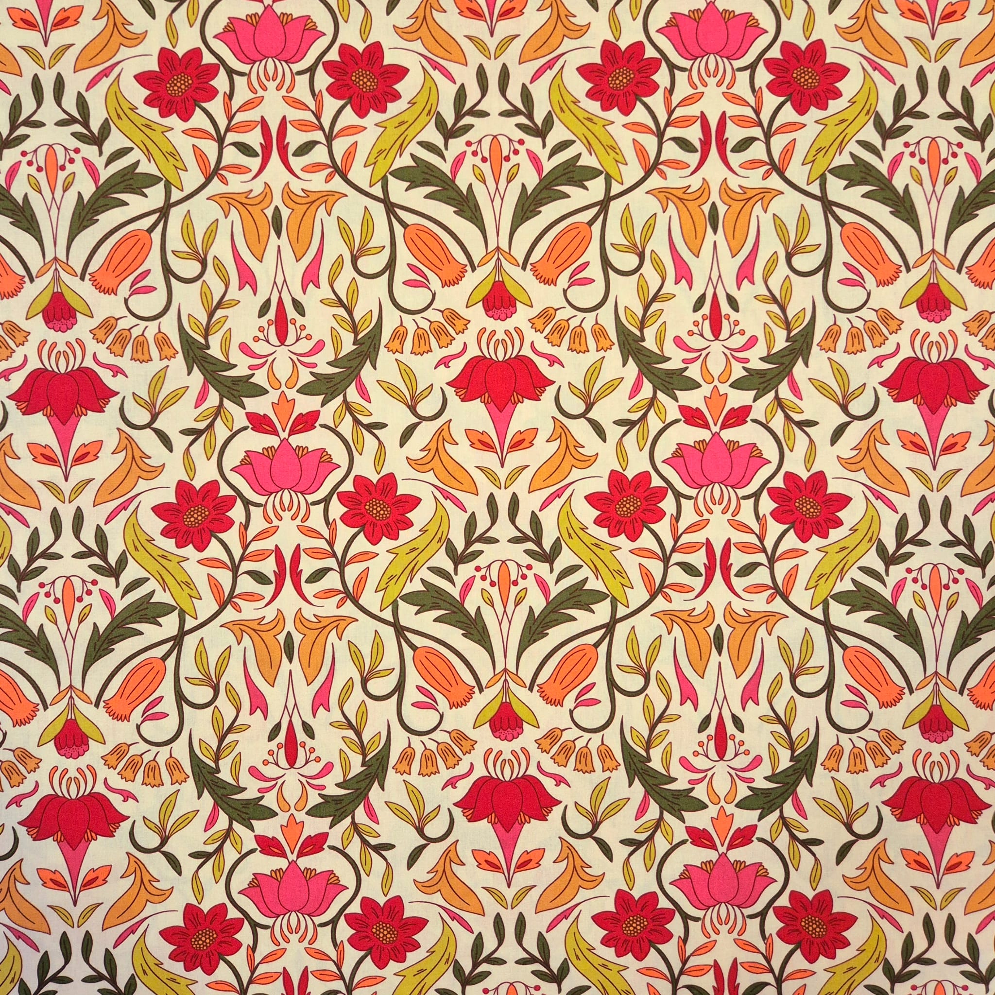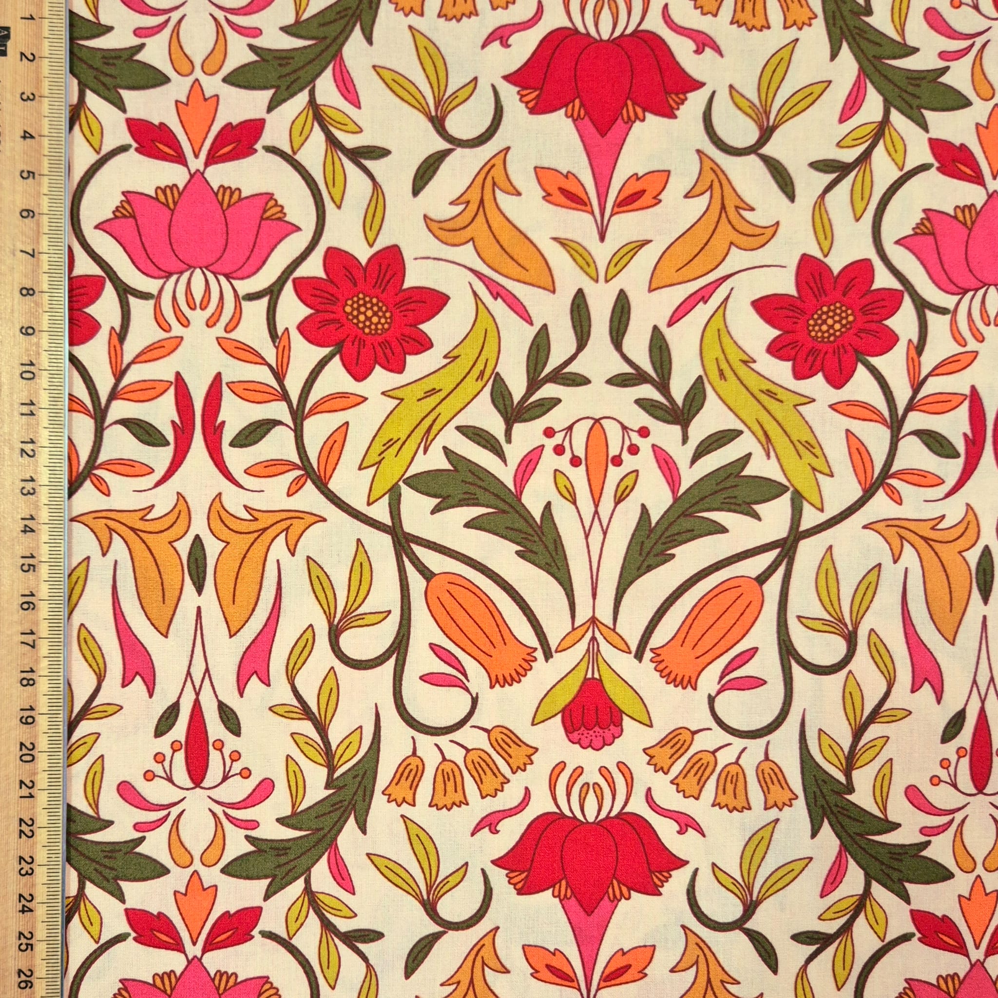 Der Preis bezieht sich auf 1/2 Laufmeter (0,5 m Länge x 1,50 m Breite) Baumwollstoff, einseitig bedruckt mit verschiedenen Blumen und Ranken in wrmen Farben auf zartem lachsrosafarbenem Fond.