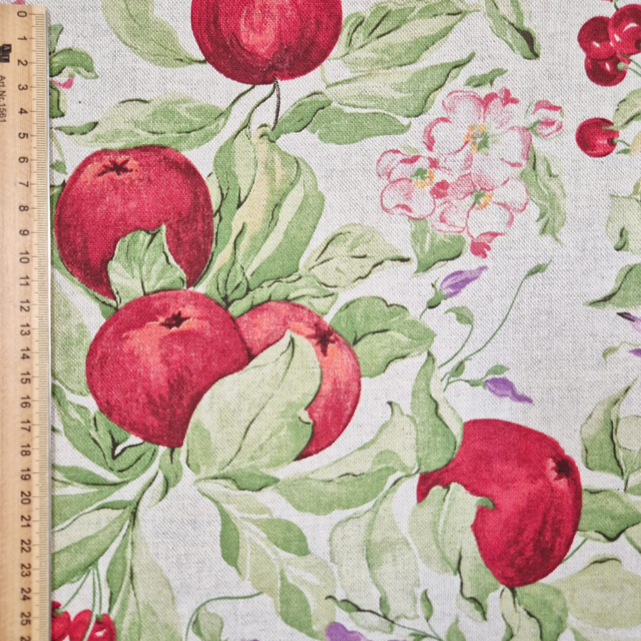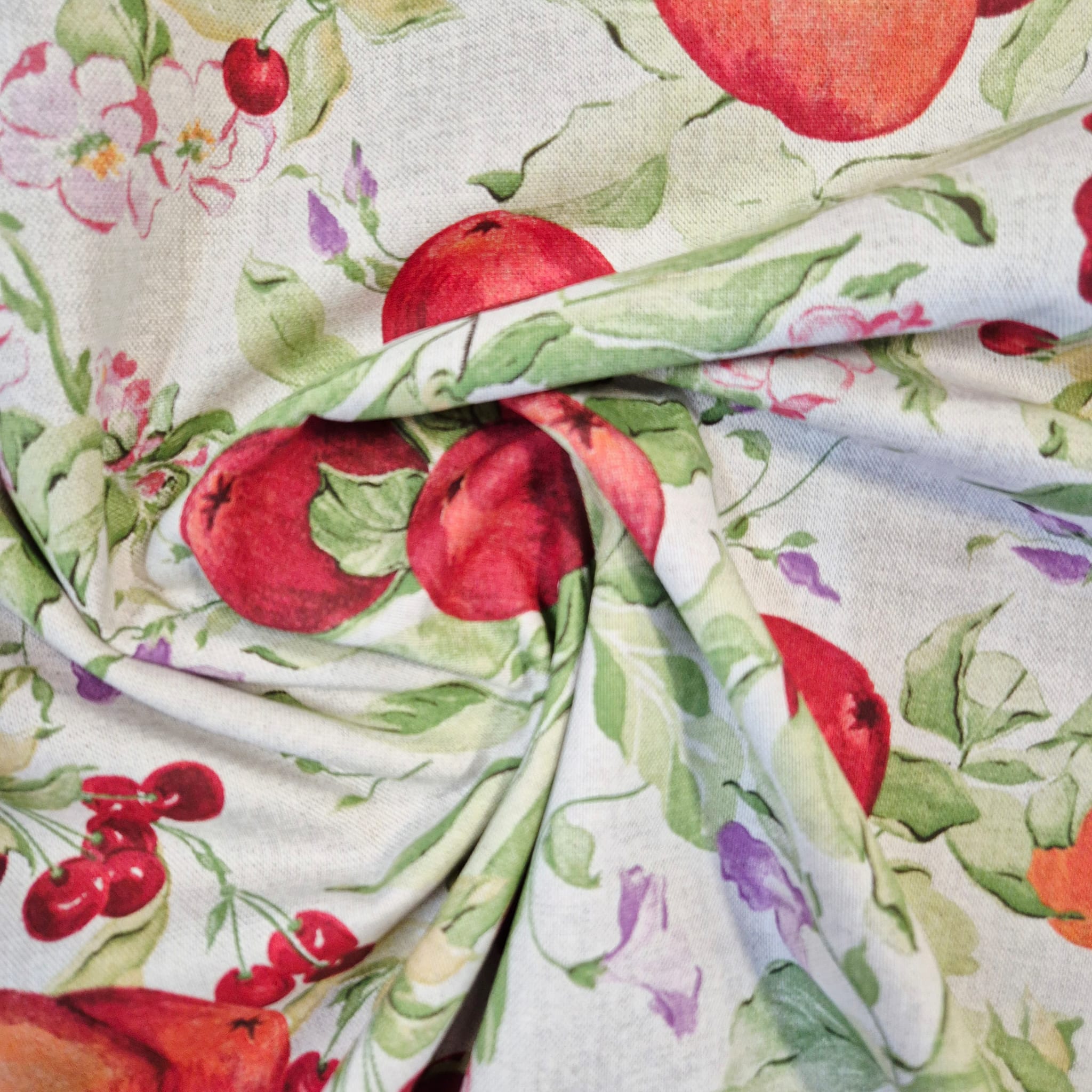 Der Preis gilt je 1/2 Laufmeter (0,5 m Länge x 1,40 m Breite ) Baumwoll-Mischgewebe, einseitig bedruckt mit reifen Äpfeln und Kirschen und zarten Blüten. Ein wunderschön sommerliches Dessin aus Italien, welches auf der leinenartigen Baumwollmischqualität perfekt zur Geltung kommt.