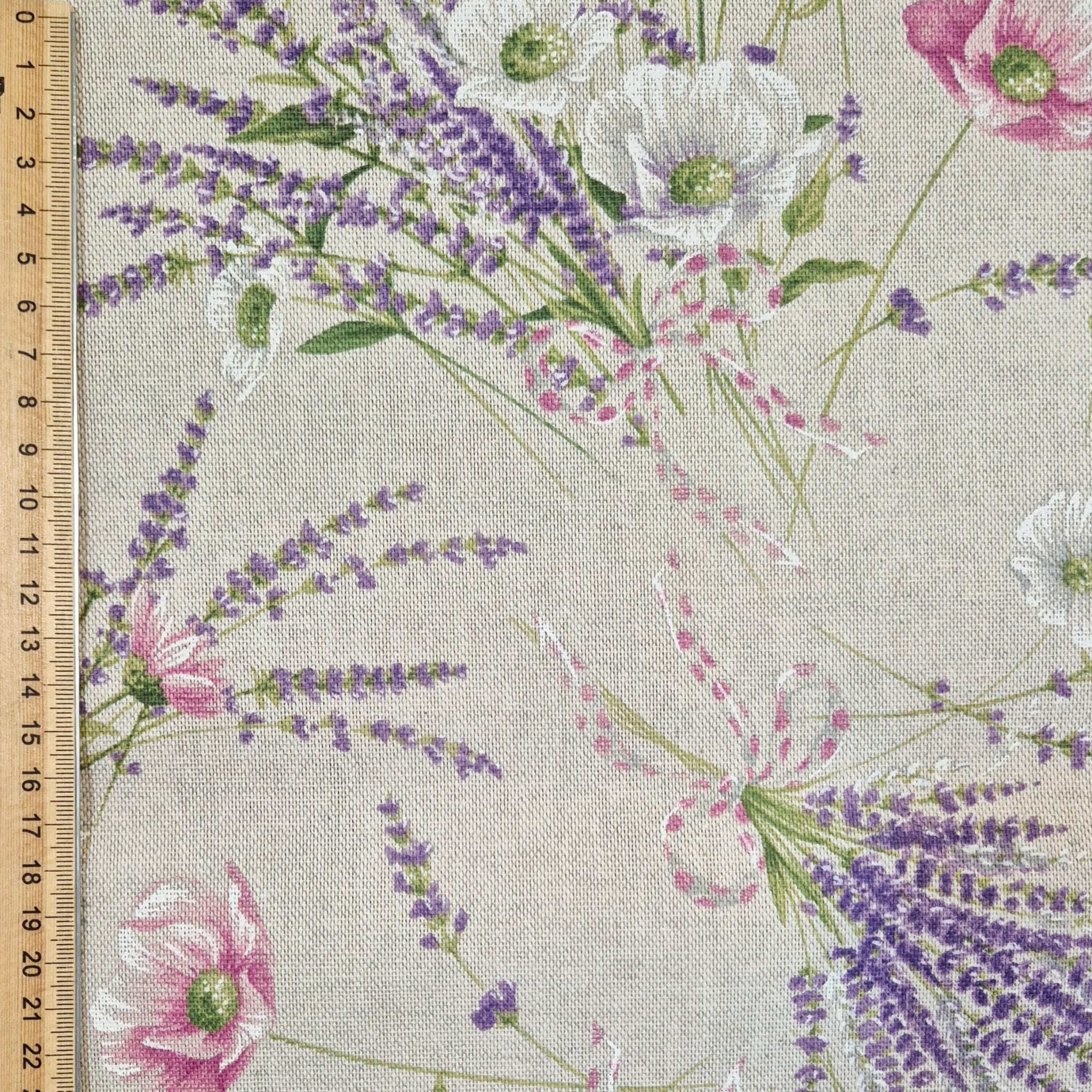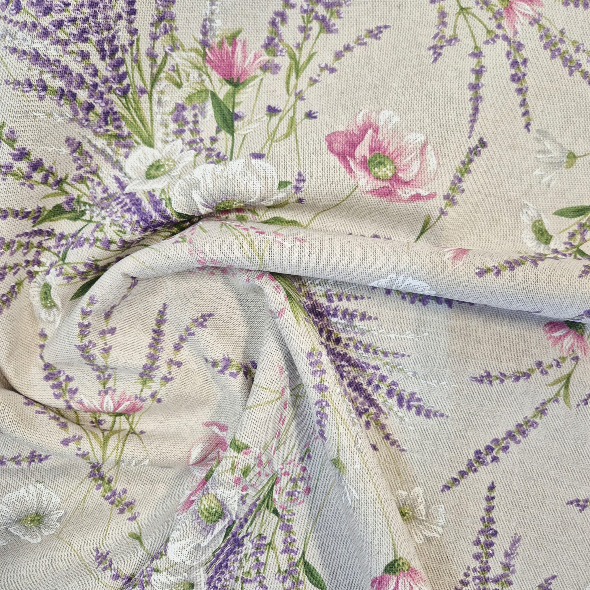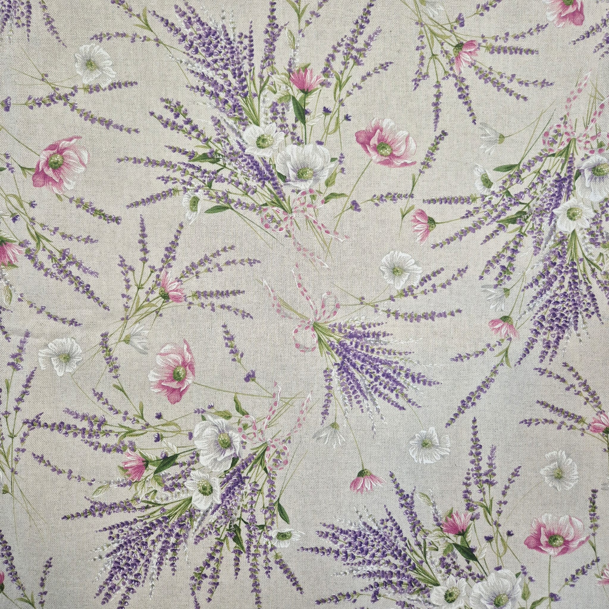 Der Preis gilt je 1/2 Laufmeter (0,5 m Länge x 1,40 m Breite ) Baumwoll-Mischgewebe, einseitig bedruckt mit zarten Blumensträußen aus Lavendel und rosafarbenen und weißen Mohnblumen. Ein zauberhaftes, sommerliches Dessin aus Italien, welches auf der leinenartigen Baumwollmischqualität perfekt zur Geltung kommt.
