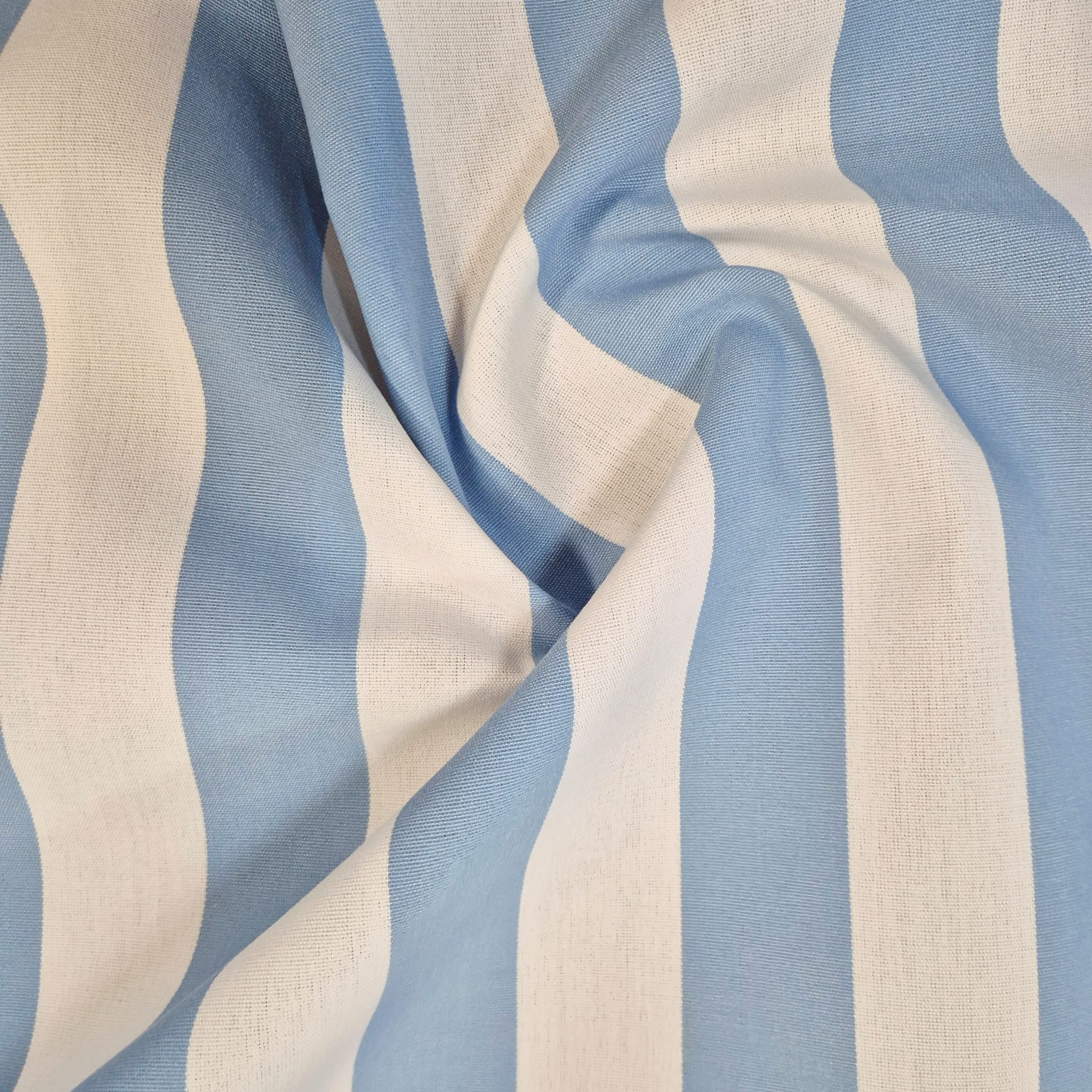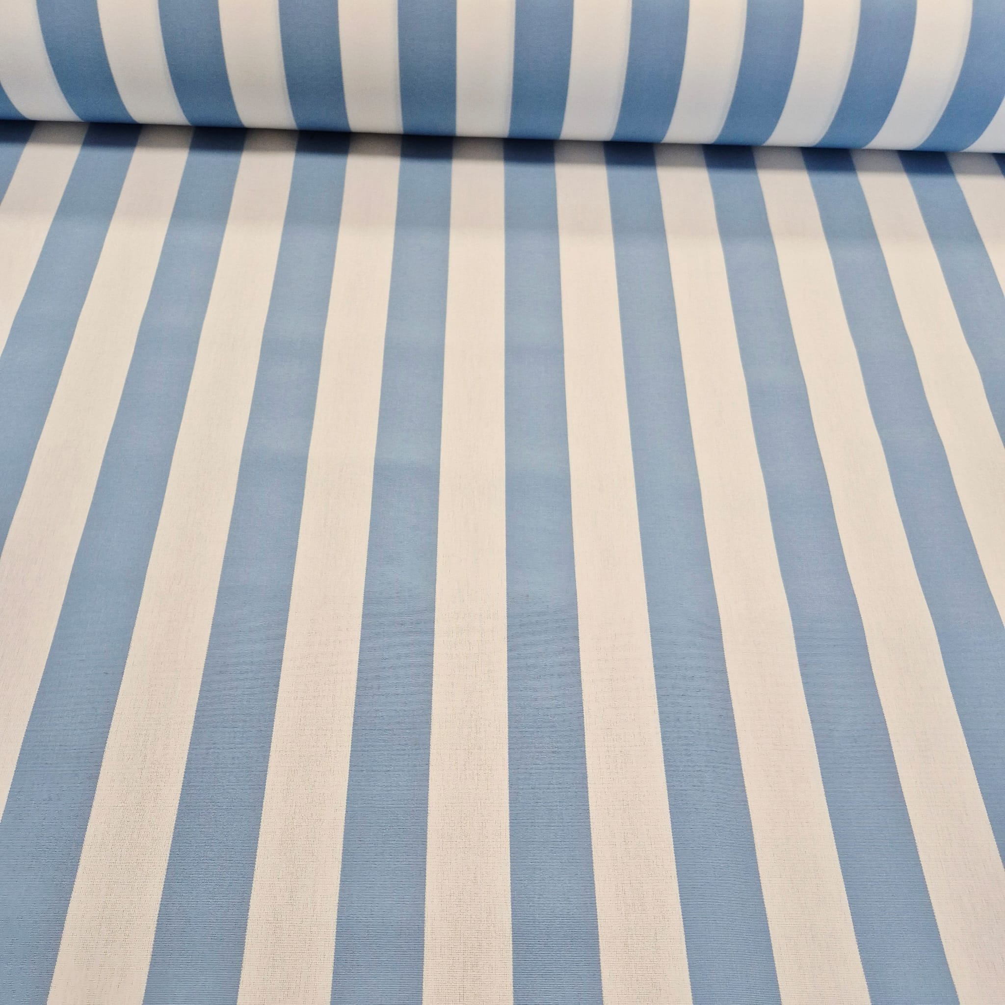 Der Preis gilt je 1/2 Laufmeter Outdoorgewebe, längs gestreift in den Farben Hellblau/Himmelblau und Weiß. Die 5cm breiten Streifen geben dem vielseitig einsetzbaren, robusten Gewebe einen frischen, zeitlosen Look.