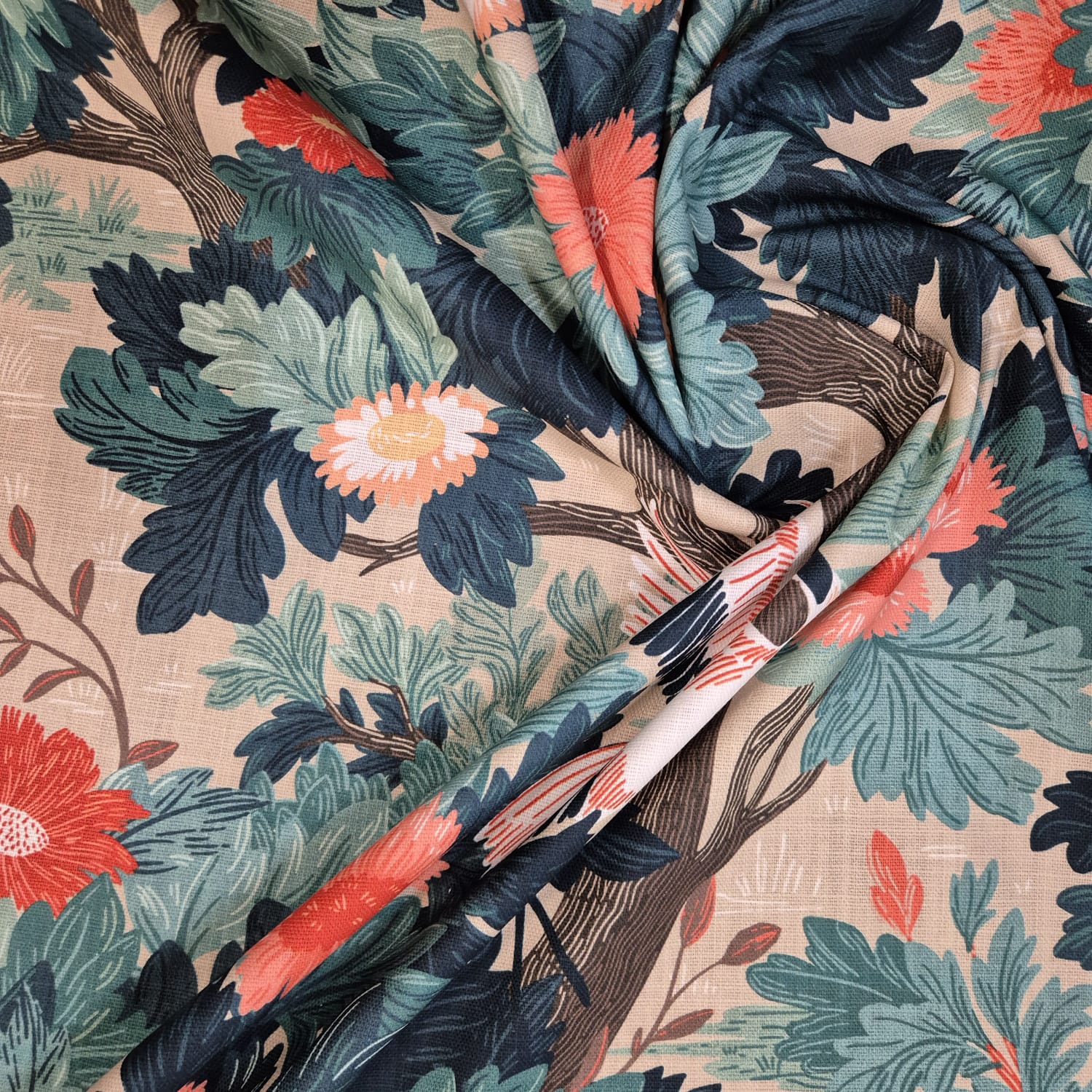 Produktinformationen "Stoff Baumwolle "Kraniche" Blumen Blätter Leinenoptik Digitaldruck 0,5"