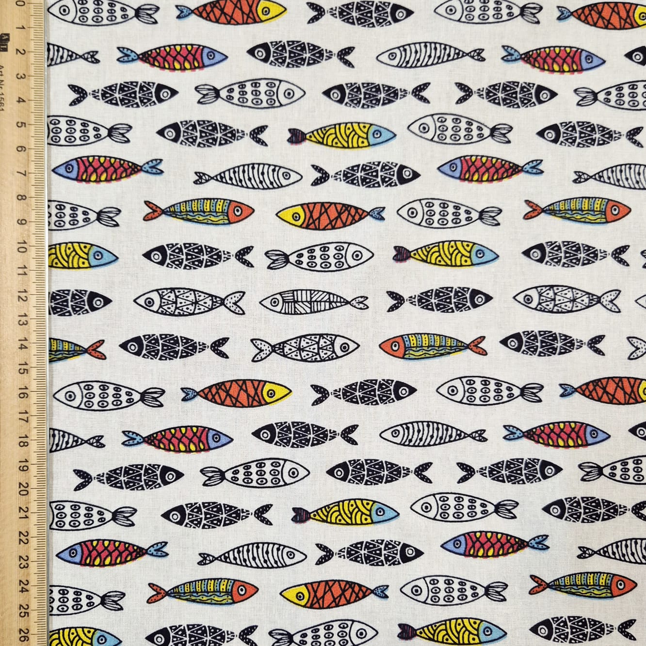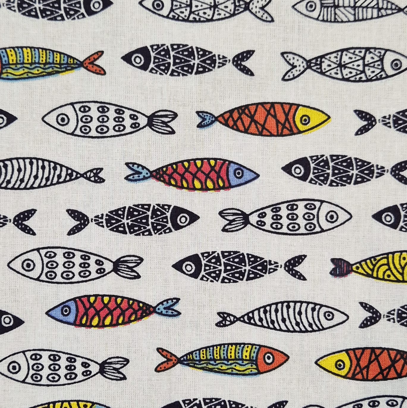 Der Preis gilt je 1/2 Laufmeter ( 0,5 m Länge x 1,45 m Breite ) Baumwollstoff, einseitig bedruckt mit unterschiedlichen Fischen.. Besonders spannend wird das Muster durch die vereinzelten bunten Fische inmitten des schwarz/weißen Fischschwarmes.