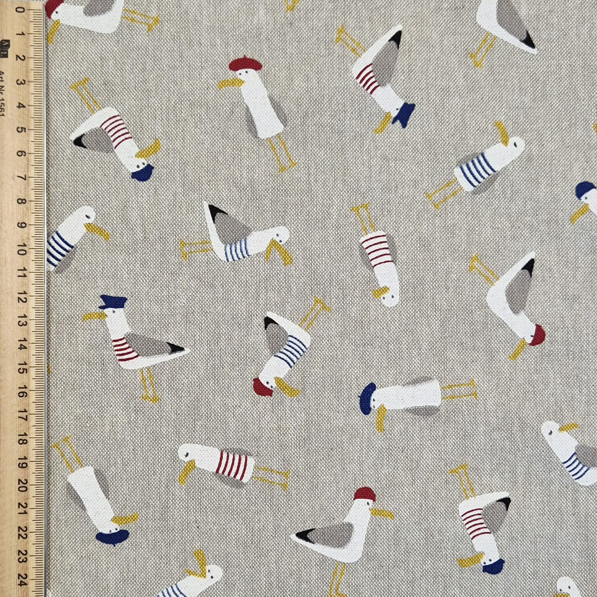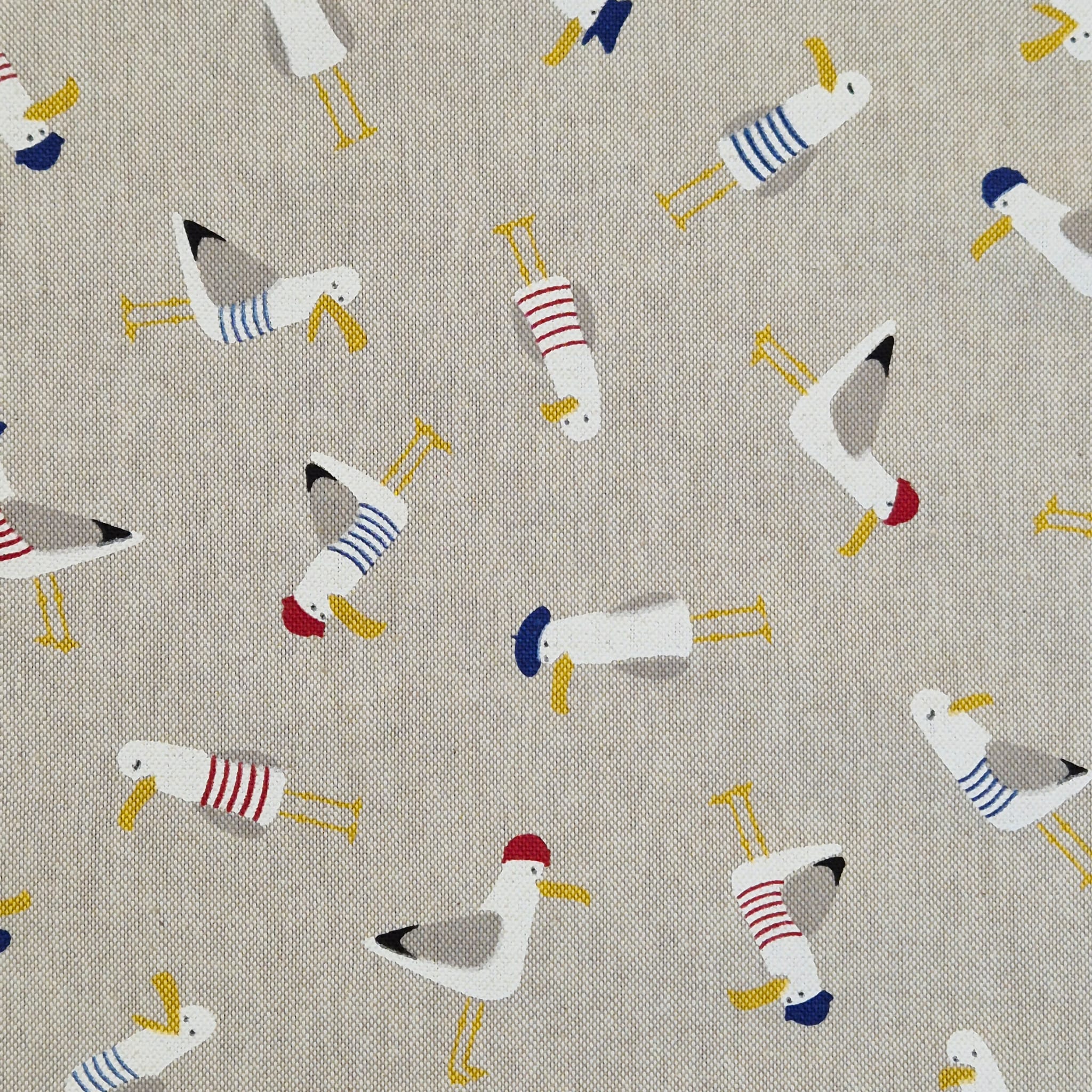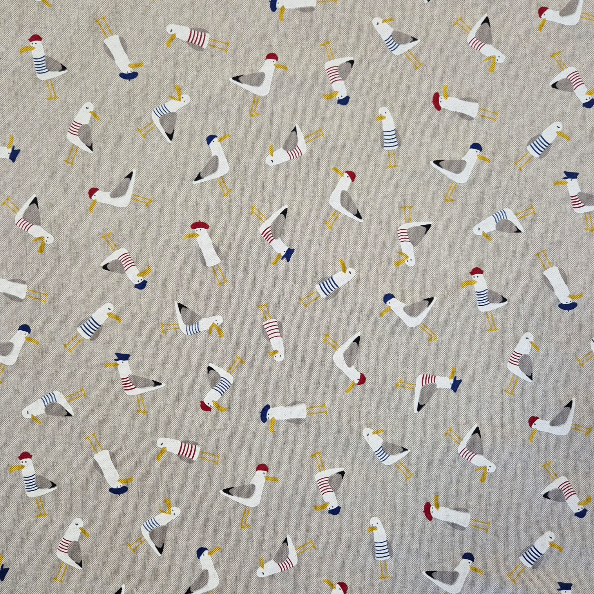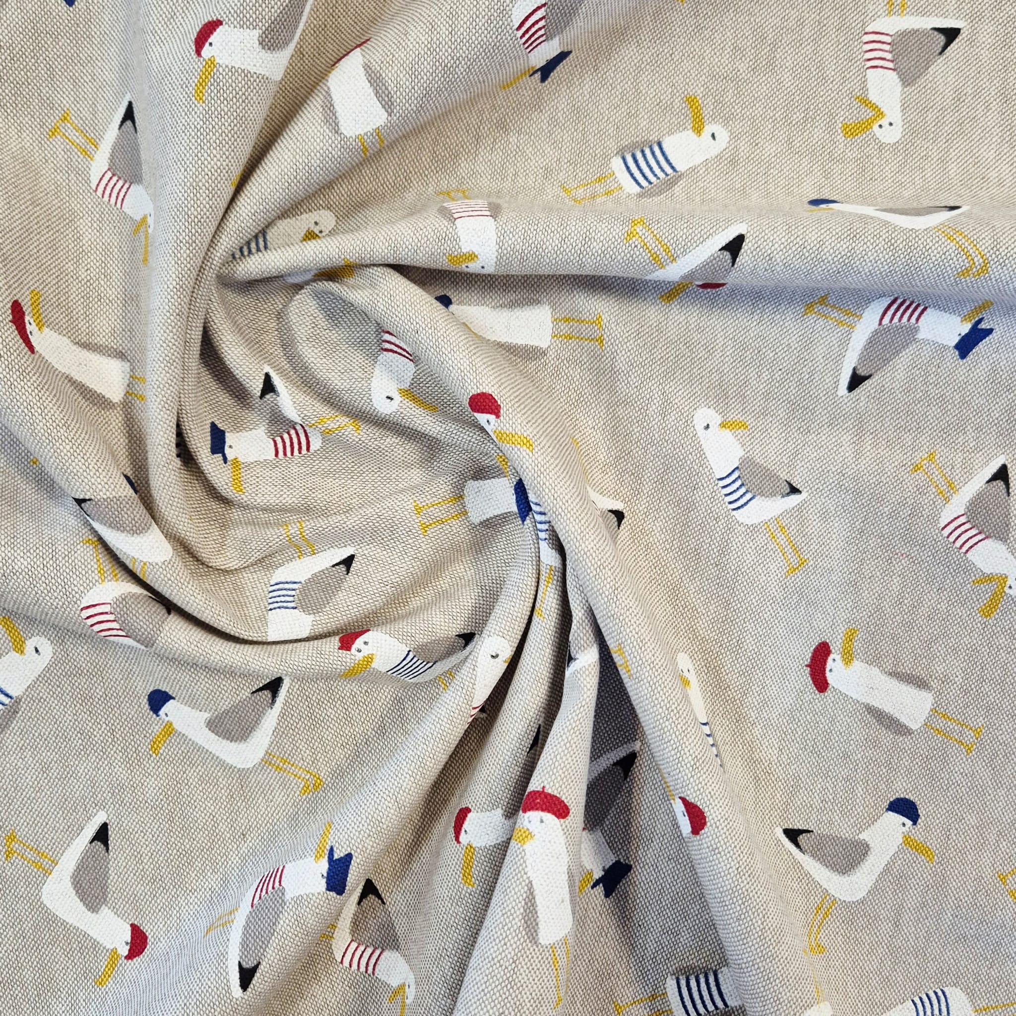 Der Preis gilt je 1/2 Laufmeter (0,5 m Länge x 1,40 m Breite ) Baumwoll-Mischgewebe, einseitig bedruckt mit witzigen Möwen auf naturfarbenem Fond. Ein cooles Dessin mit einer guten Prise nordischem Humor.
