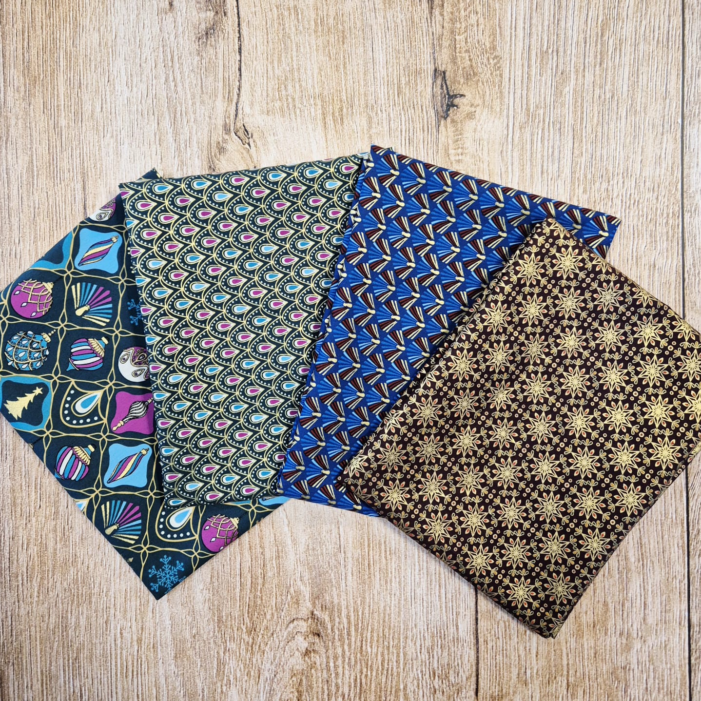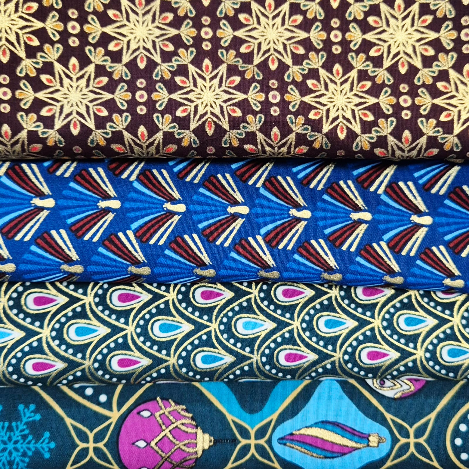 Der Preis gilt für ein Paket mit 4 unterschiedlichen Baumwollstoffen mit weihnachtlichen Motiven. Abmessung der Stücke ist 50cm x 70cm. Das Paket besteht aus den Artikeln "Fächer Art Deko", "Orient", "Magnifik", Droppar".