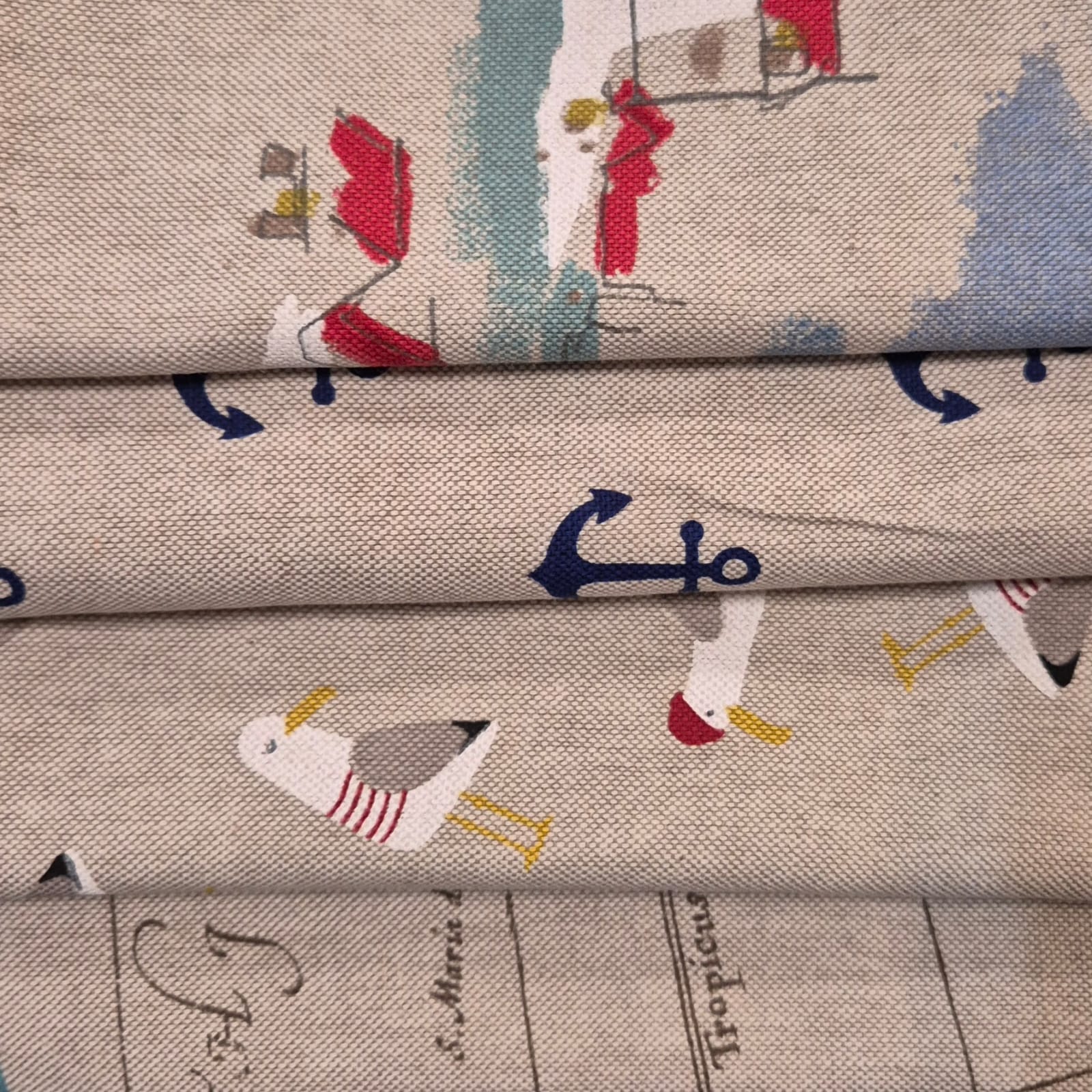 Der Preis gilt für ein Paket, bestehend aus 4 unterschiedlichen Stoffen, einseitig bedruckt mit verschiedenen maritimen Motiven.  Abmessung der Stücke ist 50cm x 70cm. Das Paket besteht aus den Artikeln "Moin" , "Seekarte", "Anker" und "Küstenliebe".
